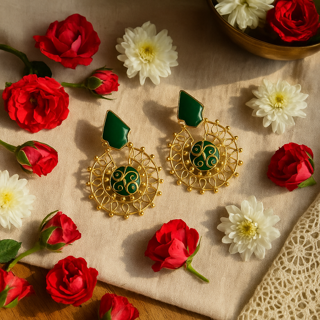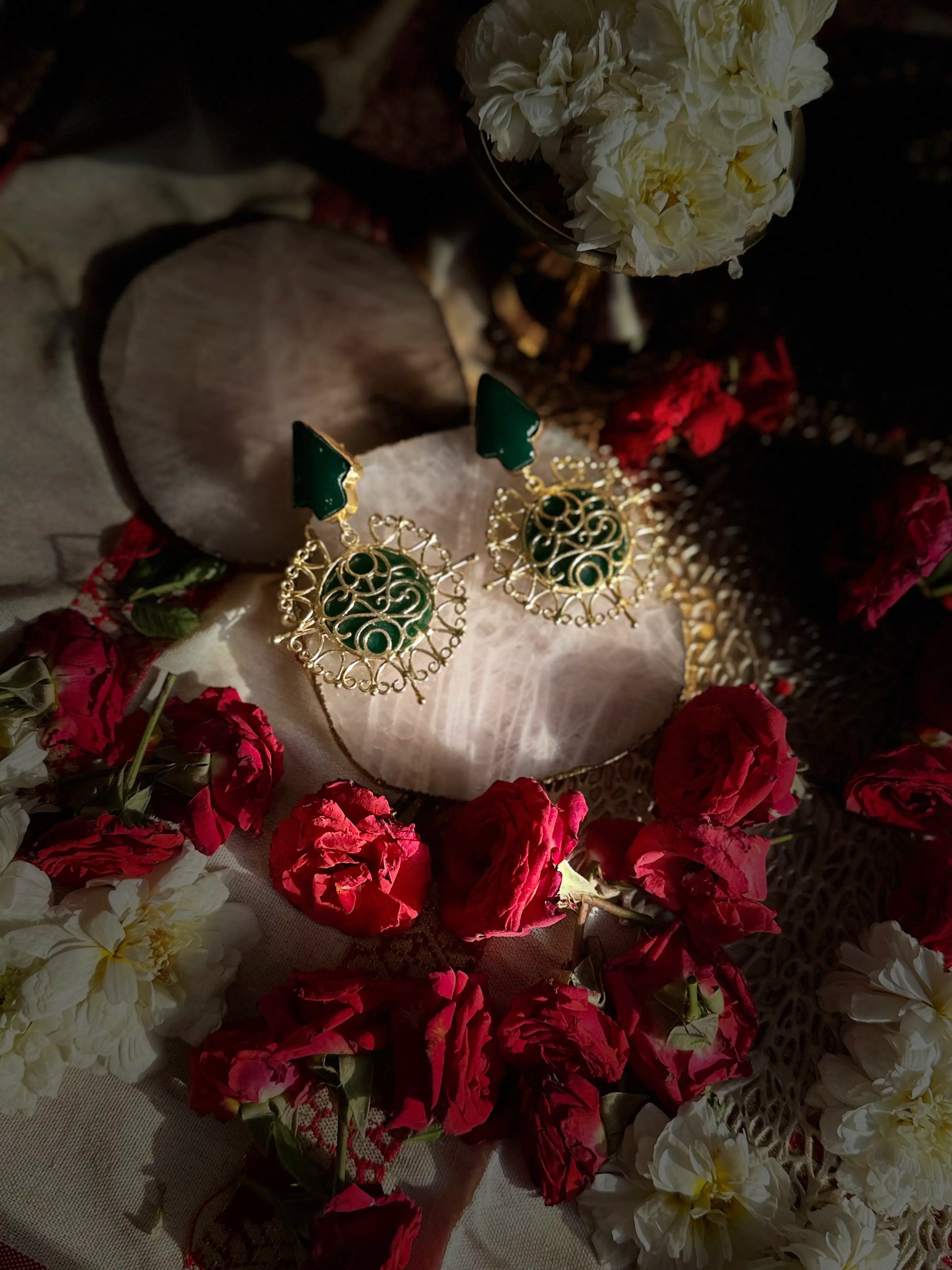 Striking the perfect harmony between heritage and haute, our Aaria Luxe Earrings are a bold take on Indo-Western glam. With a radiant gold-plated base and deep emerald green gemstones, these structured statement earrings bring luxury and edge together. Whether you’re styling a fusion outfit or elevating a classic saree, Aaria makes a power move.