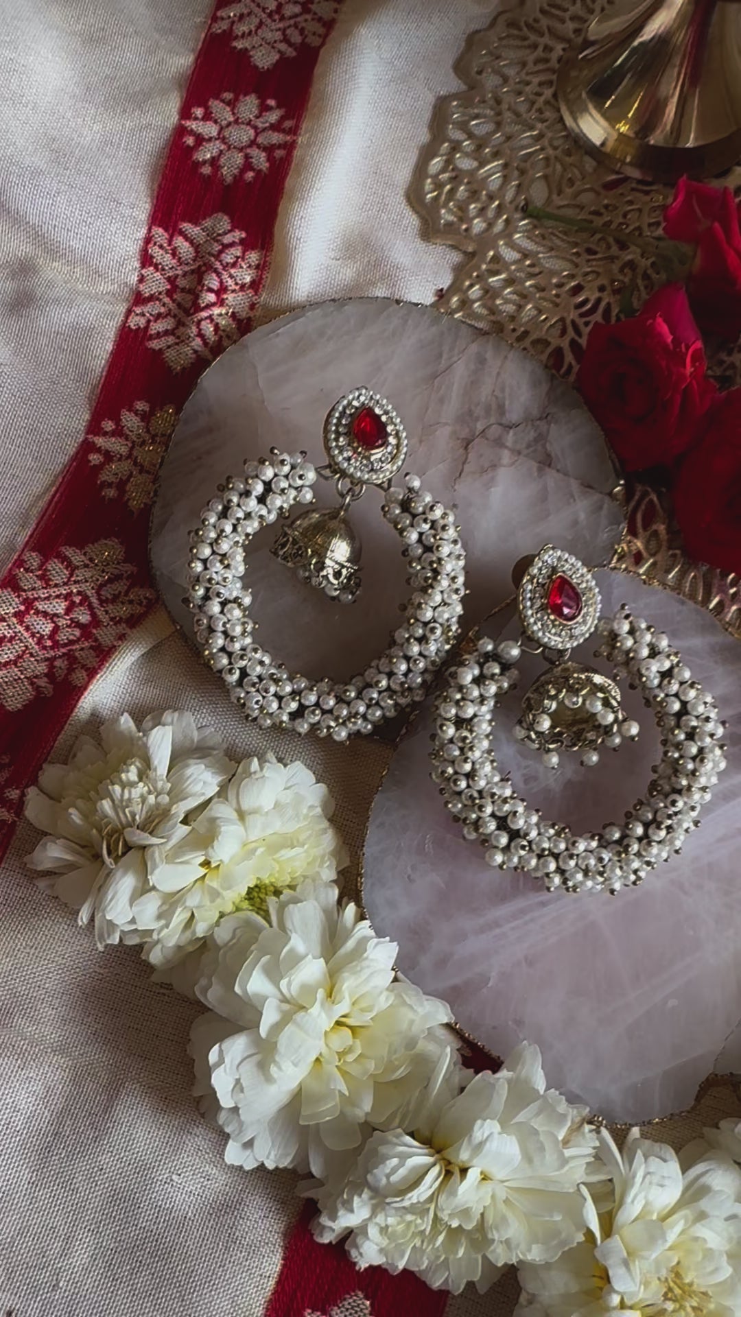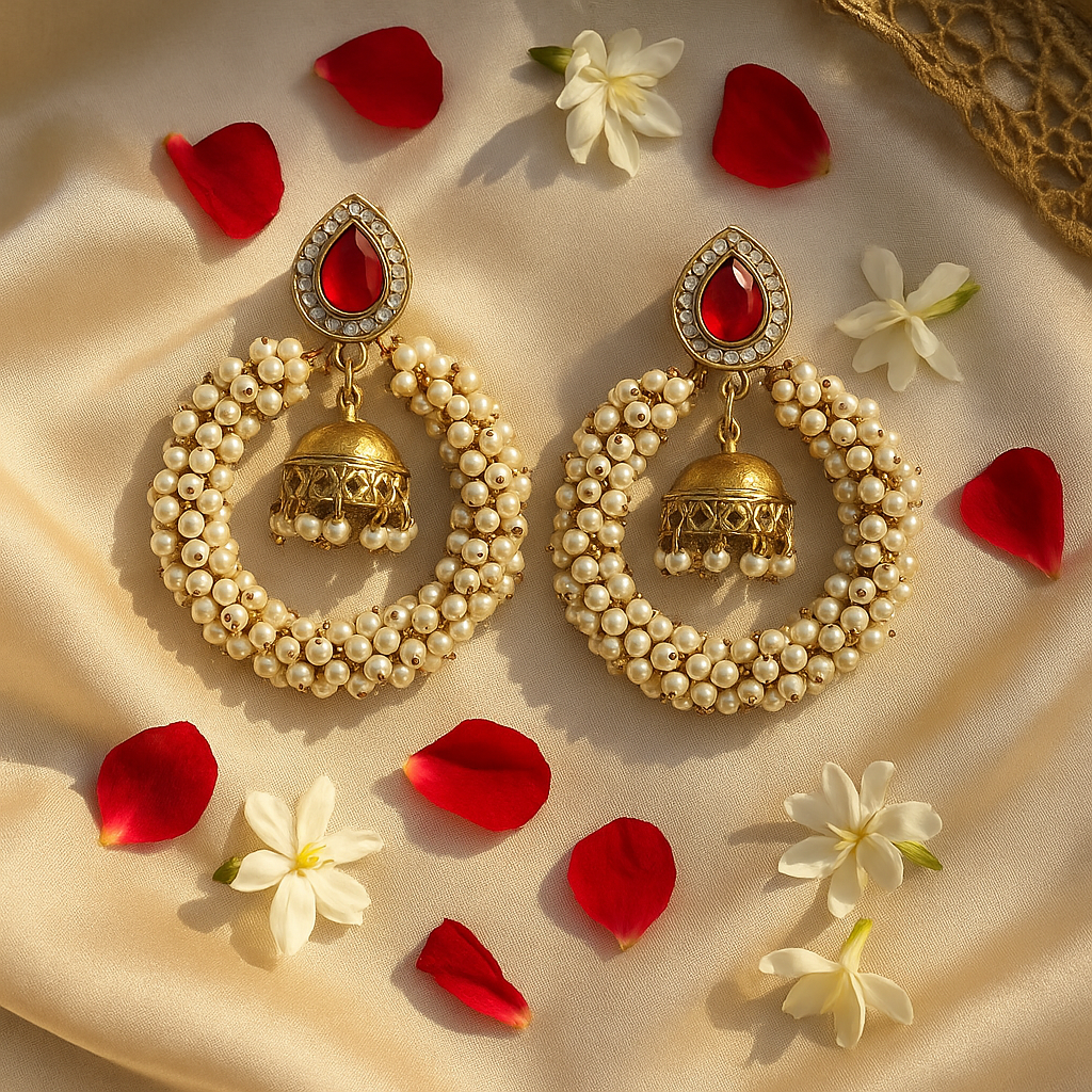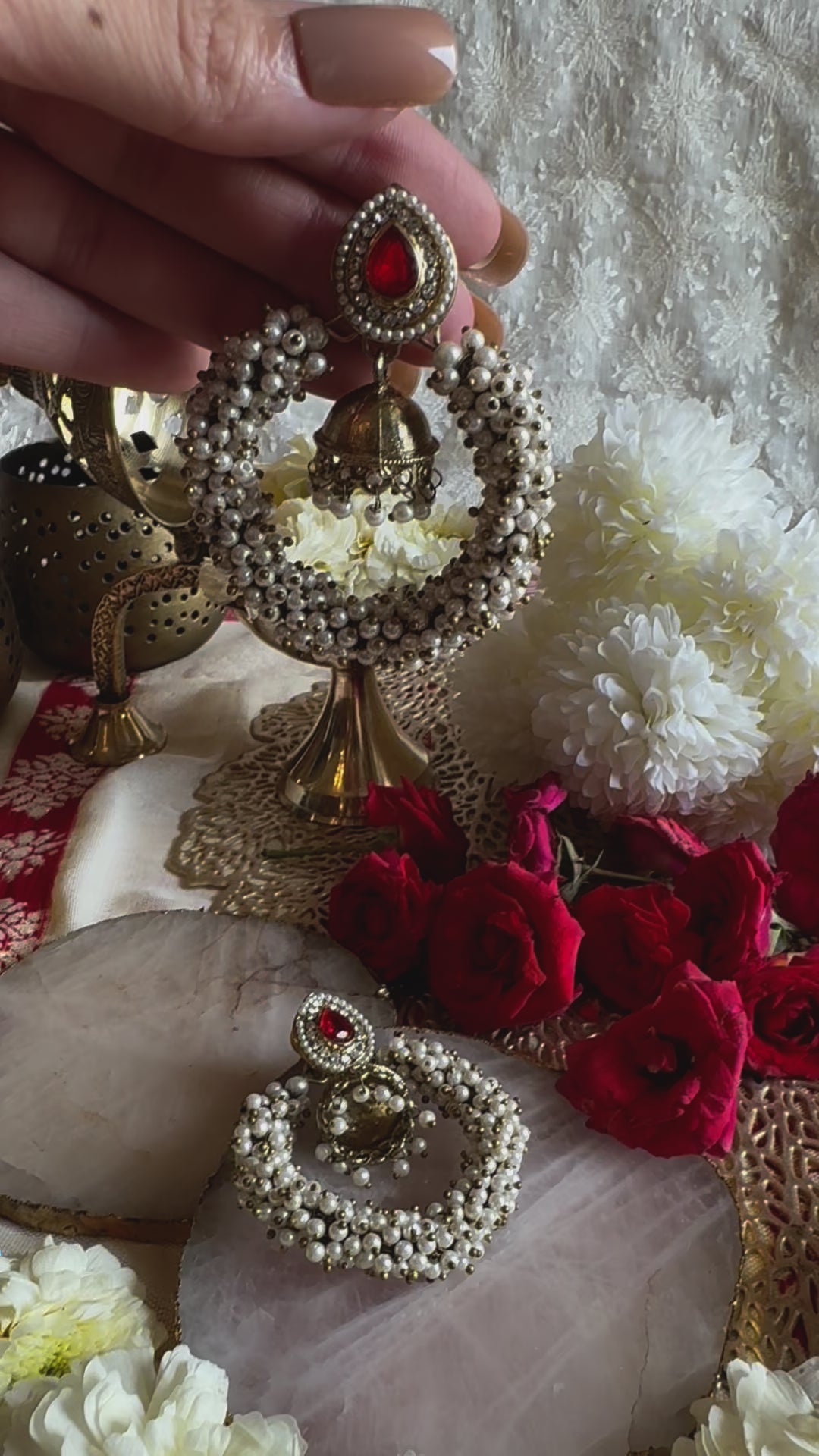 Delicate yet distinctive, our Aarohi Pearl Ember Earrings capture the essence of old-world charm reimagined for the modern muse. Crafted on a rich gold-finish base, these earrings feature a striking ruby-hued central stone, encircled by a halo of dainty white pearl beads for a truly timeless appeal.