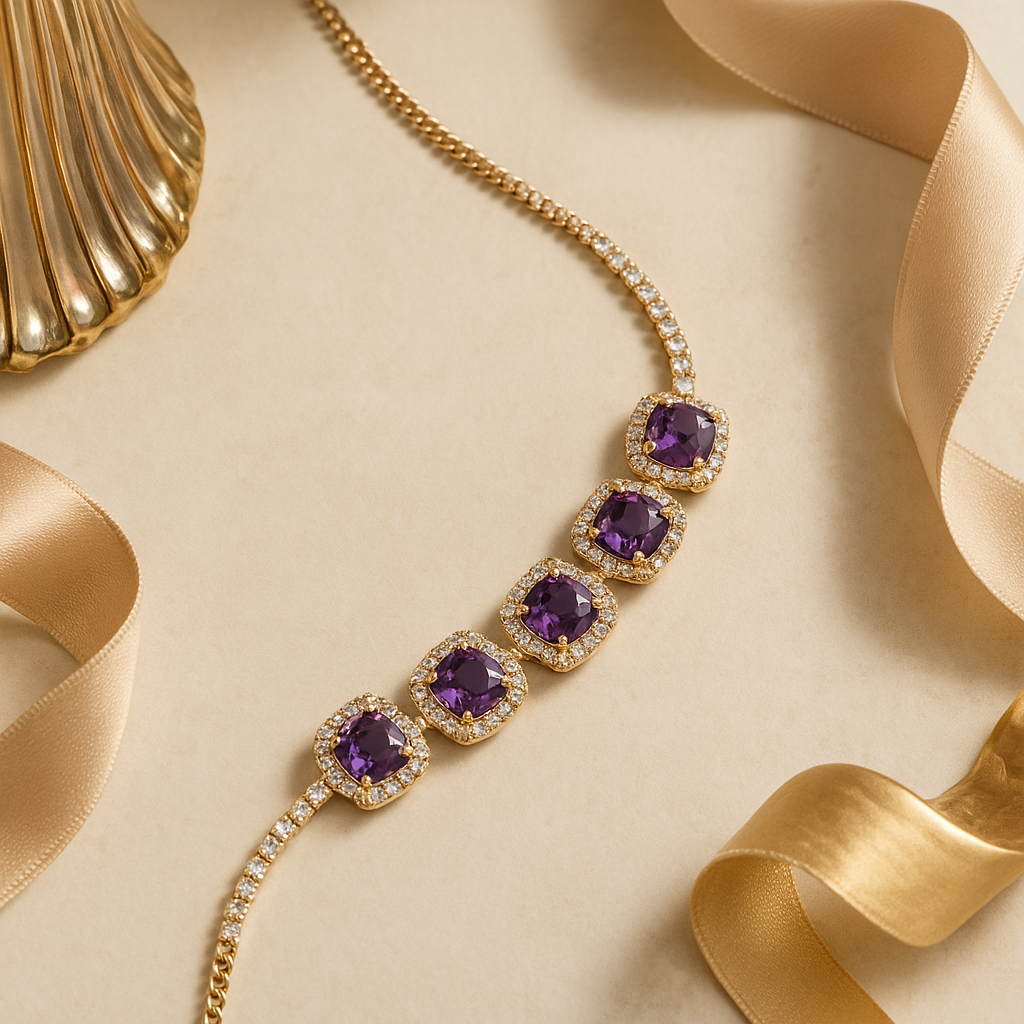 The Amara Amethyst Bracelet is an ode to timeless opulence. Showcasing five radiant amethyst-purple stones framed by halos of AAA grade American diamonds, this gold-plated bracelet shimmers with grandeur. Designed with an adjustable fit for comfort, it brings together traditional richness and modern elegance Ñ an exquisite choice for festive occasions, weddings, or statement evening wear.