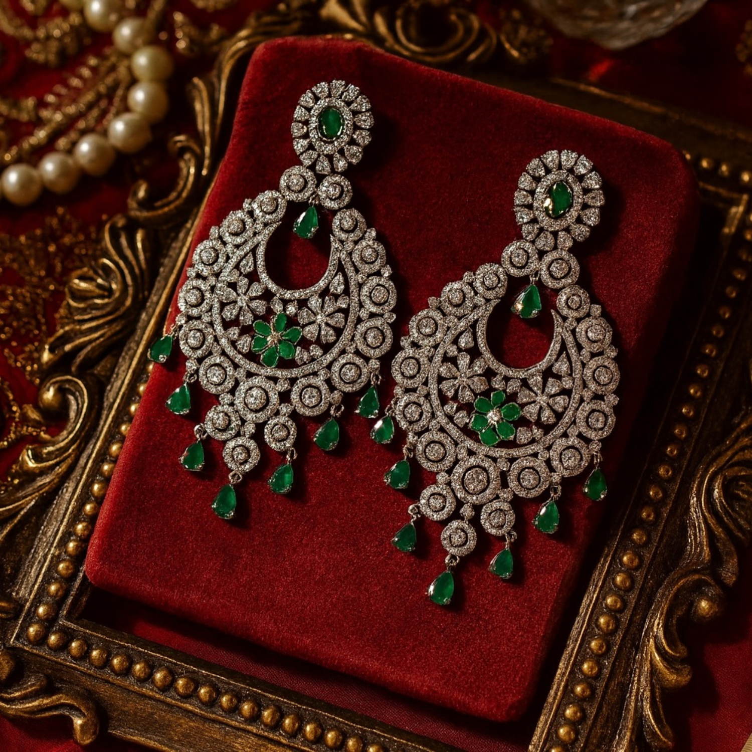 Unveil your inner royalty with our Ameera Regal Emerald Earrings, an opulent ode to vintage heirloom glamour. These statement earrings feature a majestic crescent silhouette encrusted with brilliant-cut diamond simulants, elevated with rich emerald green crystal stones. Finished in luminous rhodium plating, they exude grandeur while offering modern wearability.