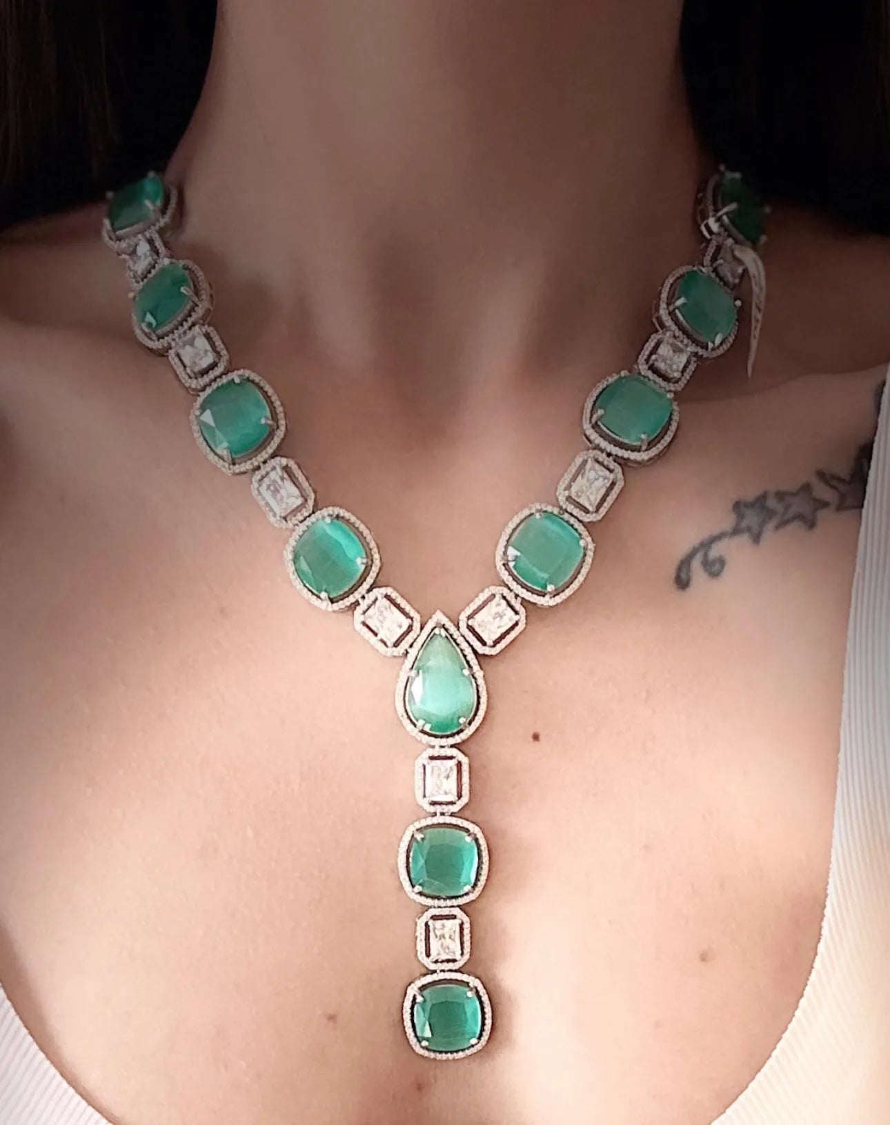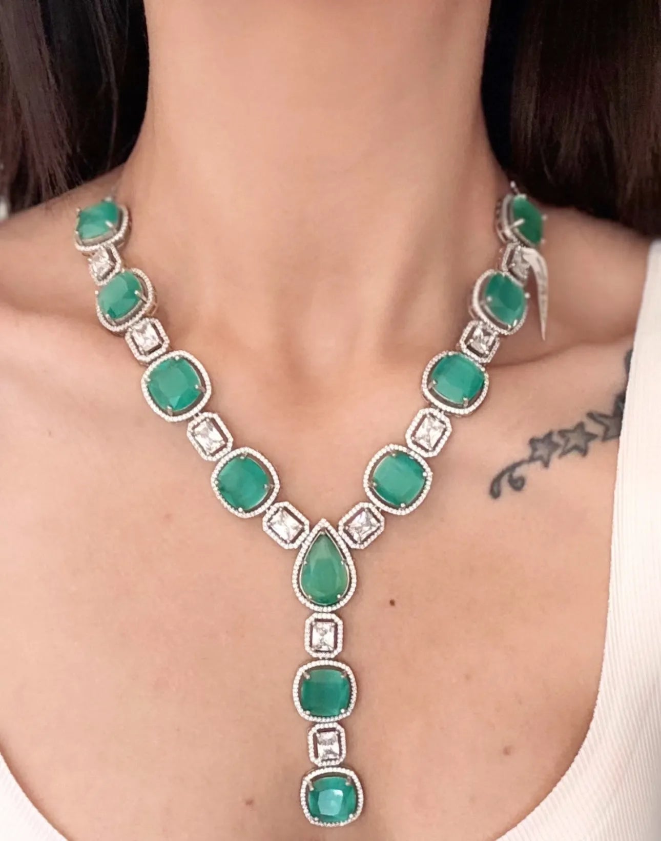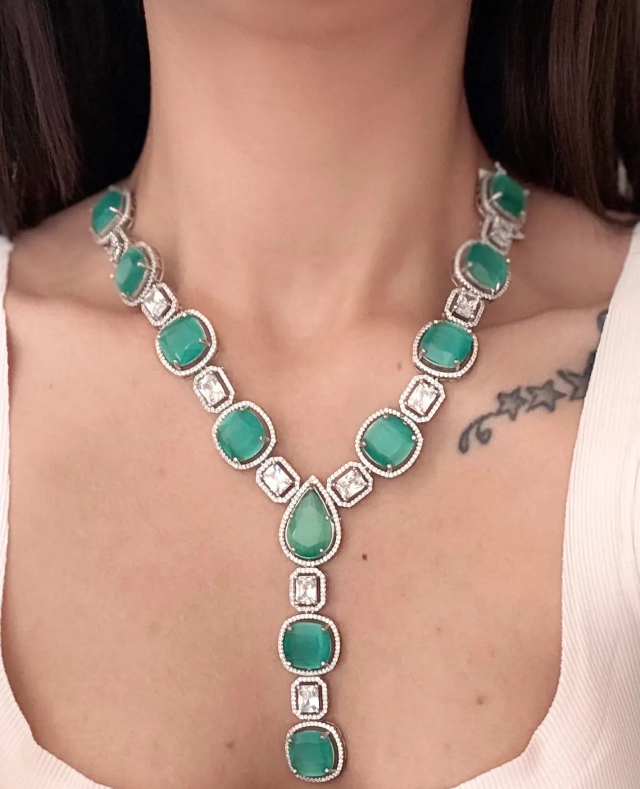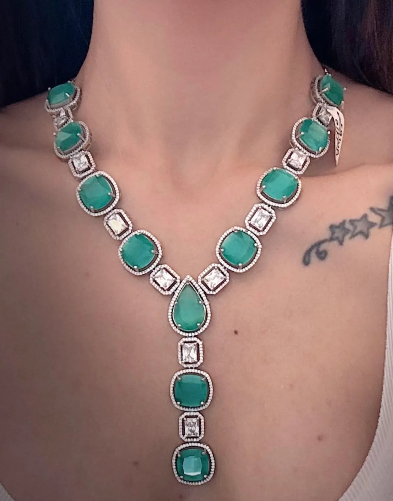 Cool-toned and contemporary, the Aqua Glint Elegance Necklace Set is designed to radiate effortless charm. With cushion and pear-cut aqua blue gemstones framed in halos of A-grade American diamonds, this set is a dream in icy brilliance. Alternating emerald-cut diamonds enhance the sophisticated symmetry, making it ideal for destination weddings, cocktail soirées, and refined day-to-evening dressing. Mounted on a polished silver-polished base, this set is both waterproof and tarnish-resistant, blending long-lasting elegance with modern design.