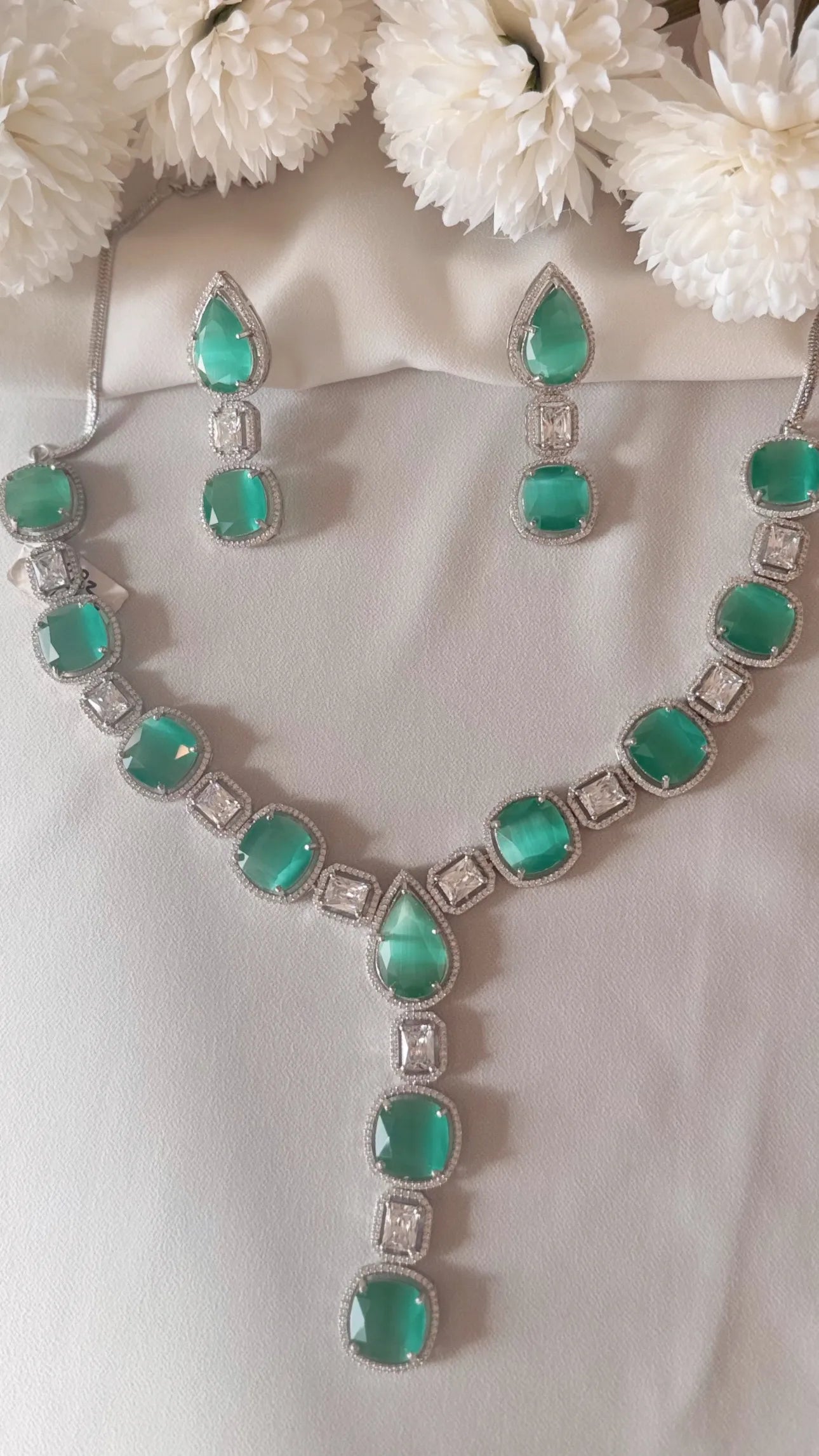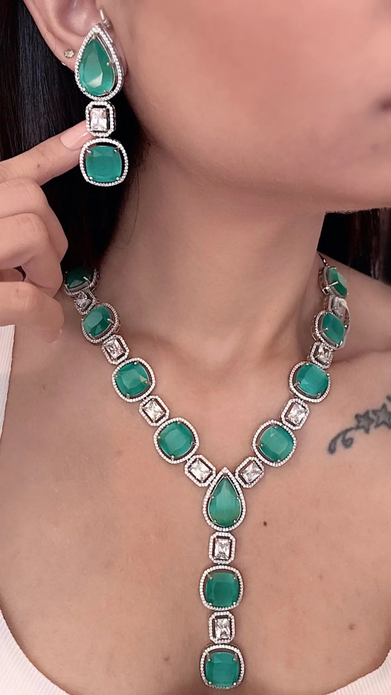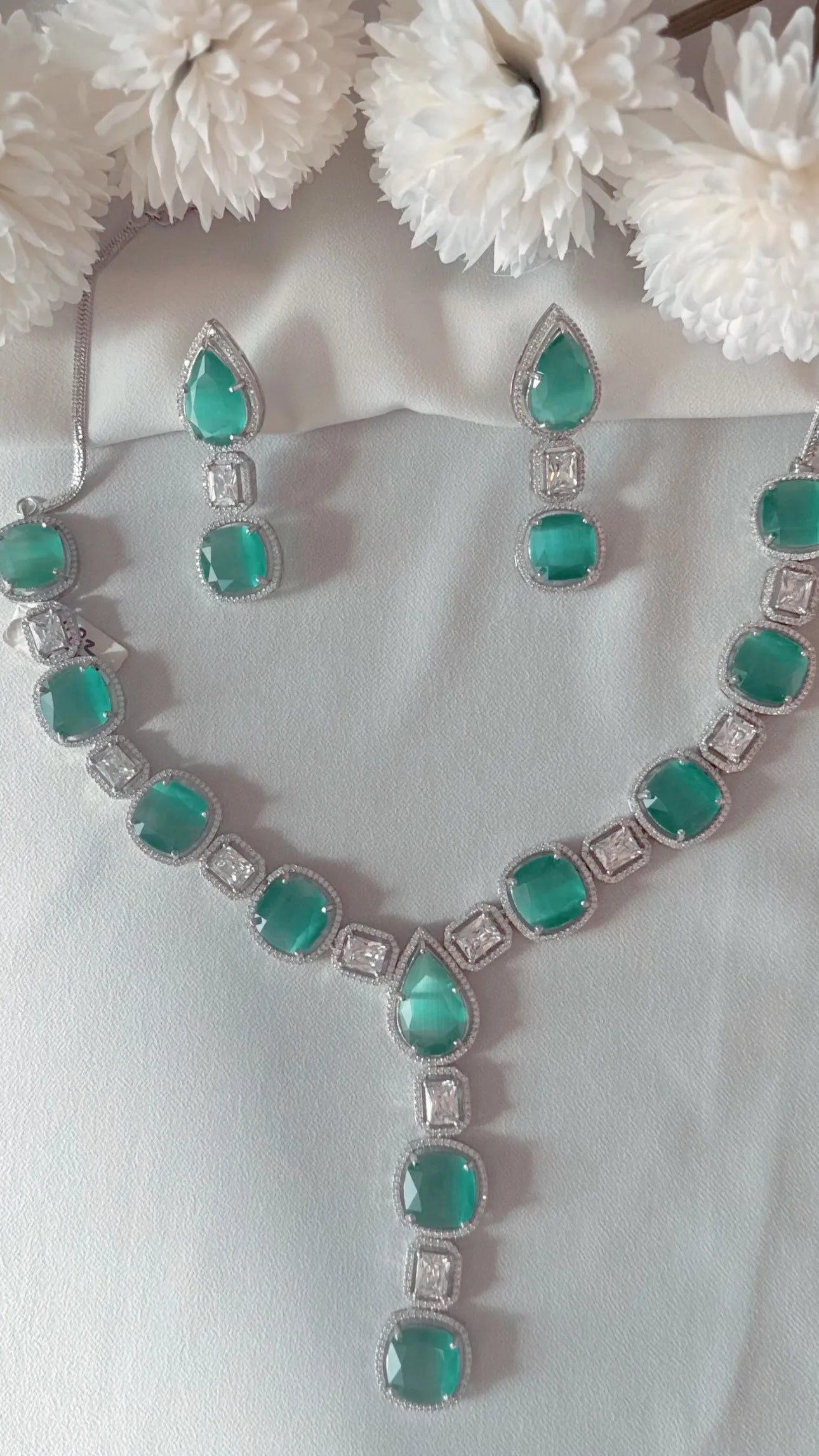 Cool-toned and contemporary, the Aqua Glint Elegance Necklace Set is designed to radiate effortless charm. With cushion and pear-cut aqua blue gemstones framed in halos of A-grade American diamonds, this set is a dream in icy brilliance. Alternating emerald-cut diamonds enhance the sophisticated symmetry, making it ideal for destination weddings, cocktail soirées, and refined day-to-evening dressing. Mounted on a polished silver-polished base, this set is both waterproof and tarnish-resistant, blending long-lasting elegance with modern design.
