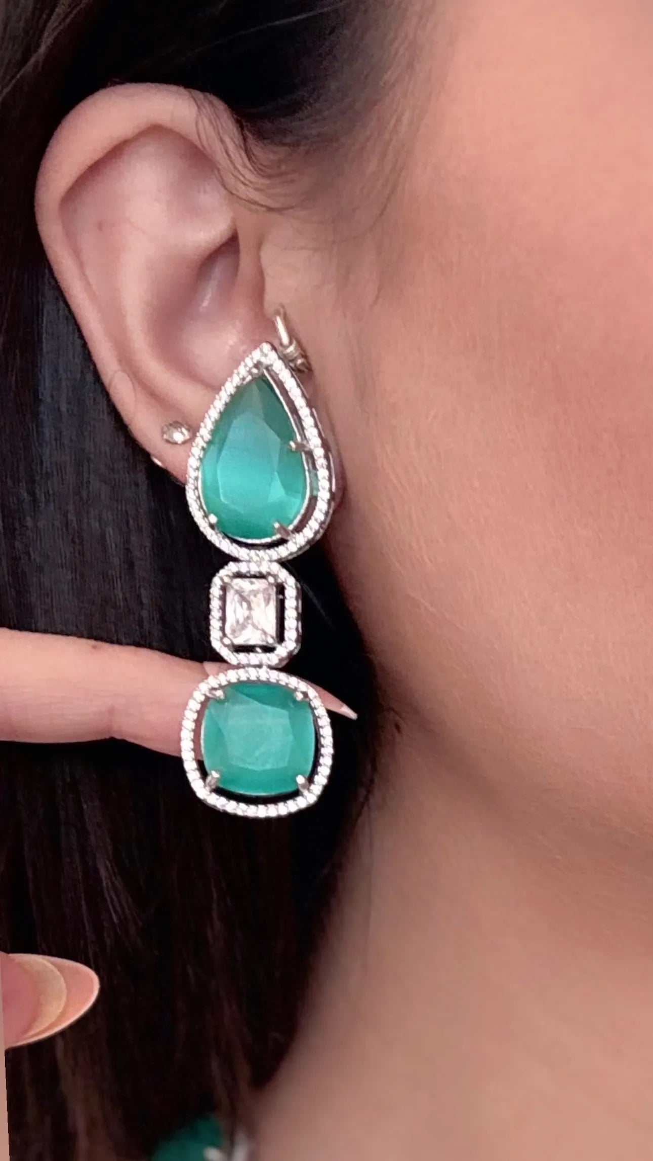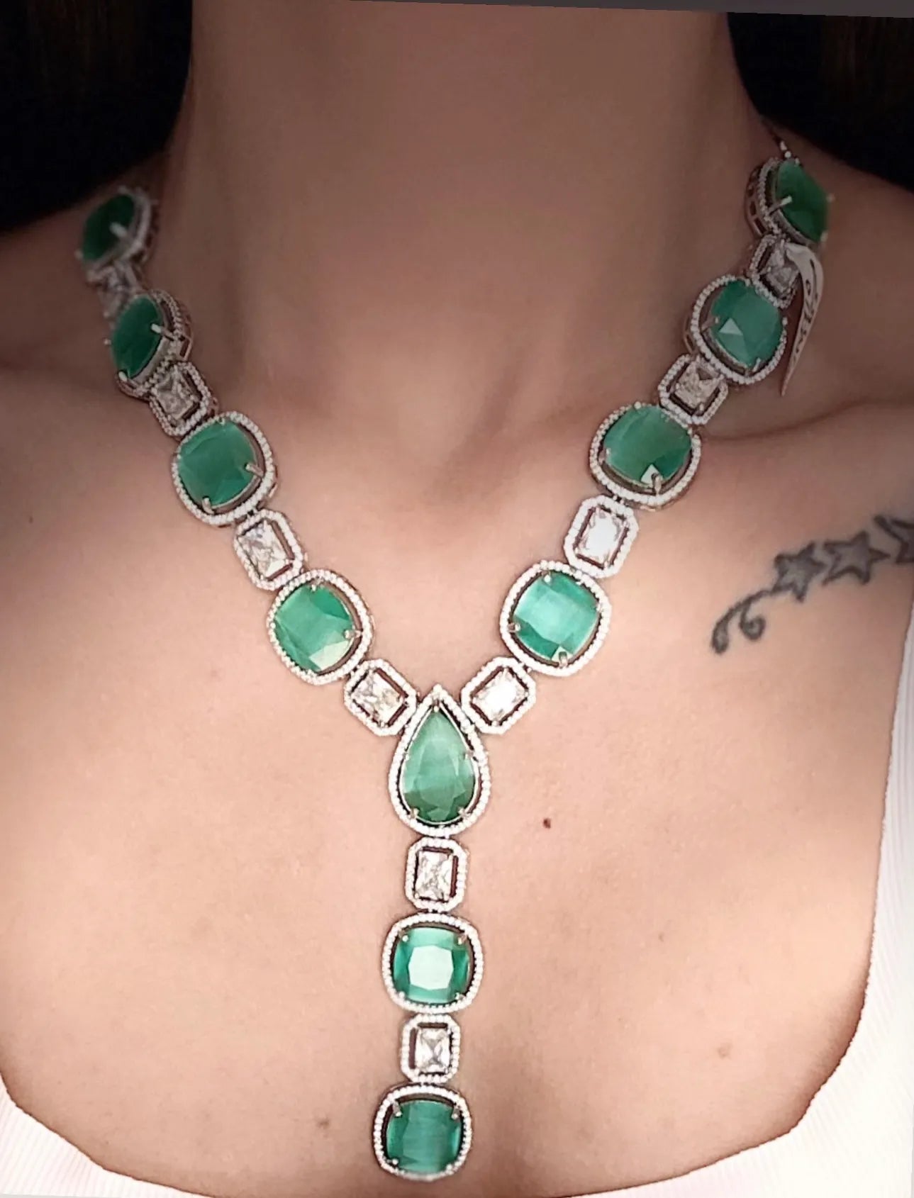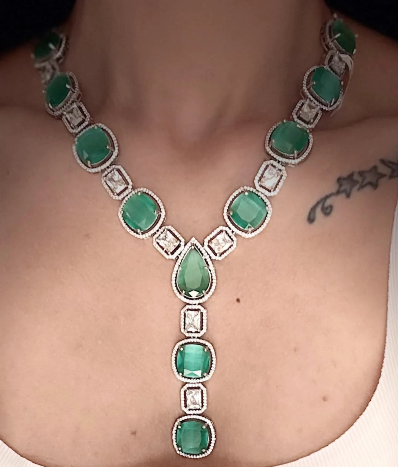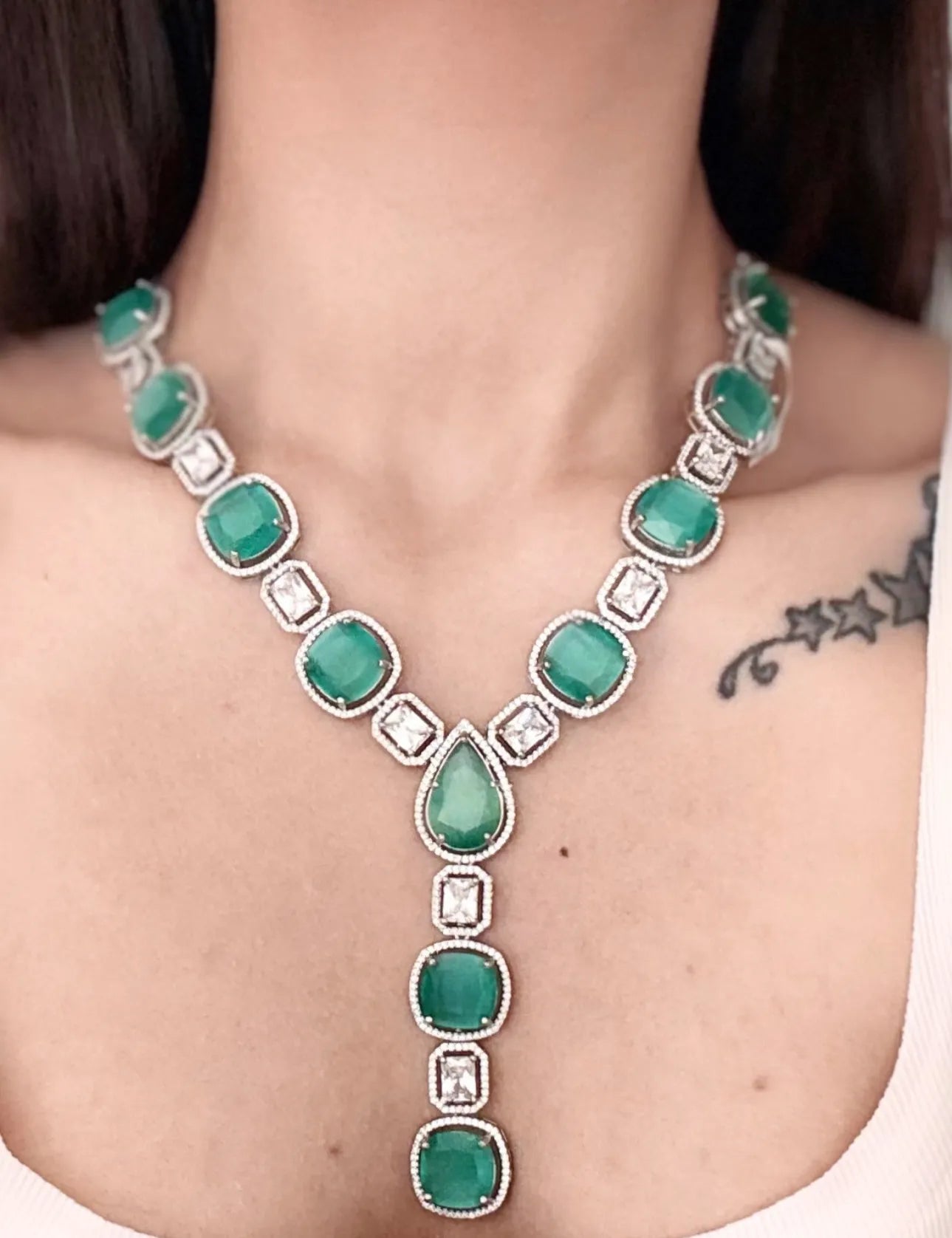 Cool-toned and contemporary, the Aqua Glint Elegance Necklace Set is designed to radiate effortless charm. With cushion and pear-cut aqua blue gemstones framed in halos of A-grade American diamonds, this set is a dream in icy brilliance. Alternating emerald-cut diamonds enhance the sophisticated symmetry, making it ideal for destination weddings, cocktail soirées, and refined day-to-evening dressing. Mounted on a polished silver-polished base, this set is both waterproof and tarnish-resistant, blending long-lasting elegance with modern design.