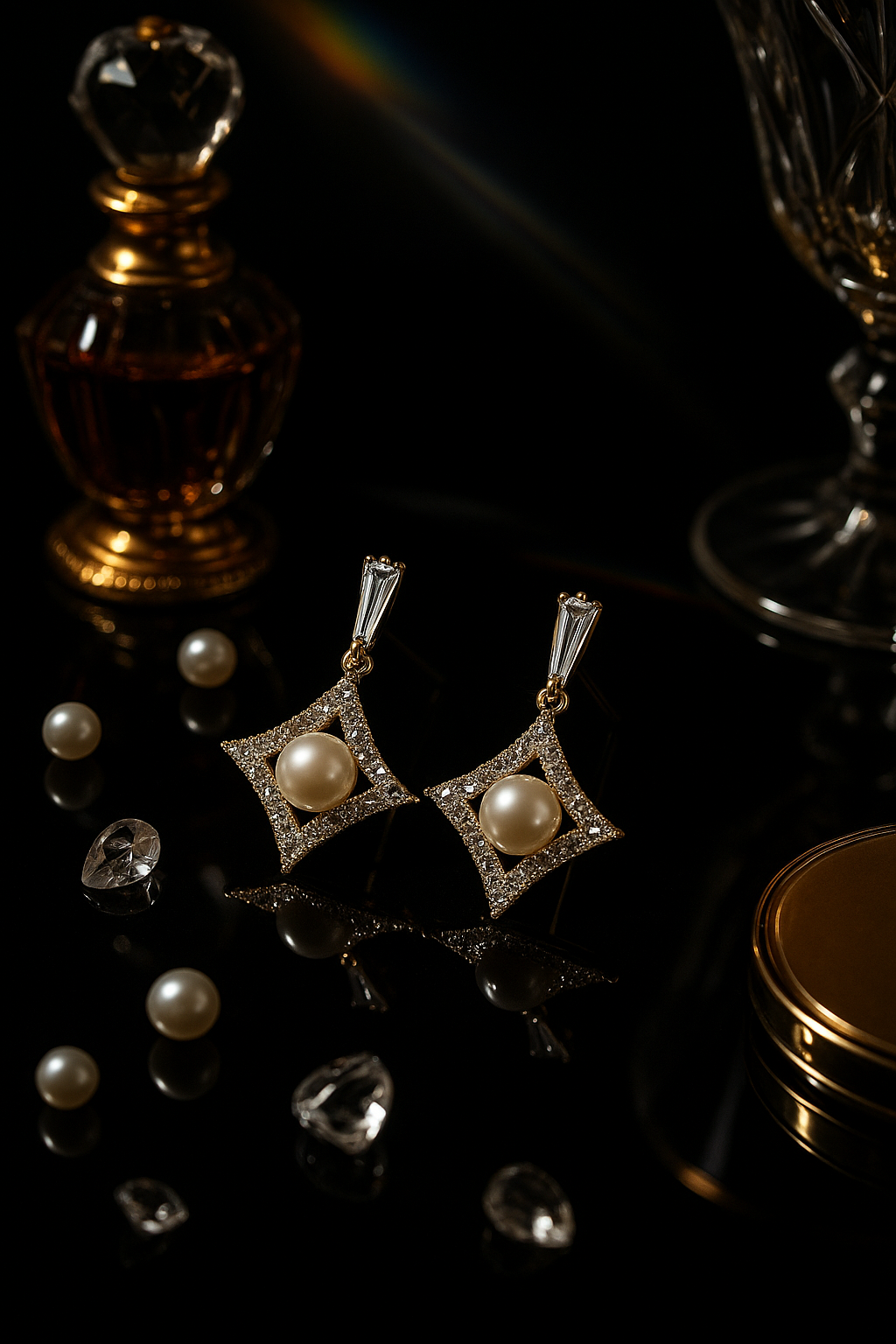 The Astria Pearl Star Earrings are a celestial blend of grace and sparkle. Featuring radiant pearls nestled in a star-shaped frame encrusted with AAA grade American diamonds, these gold-toned earrings exude timeless sophistication. Finished with a crystal top for added brilliance, theyÕre perfect for festive soirŽes, bridal wear, or elevating an evening look with modern elegance.