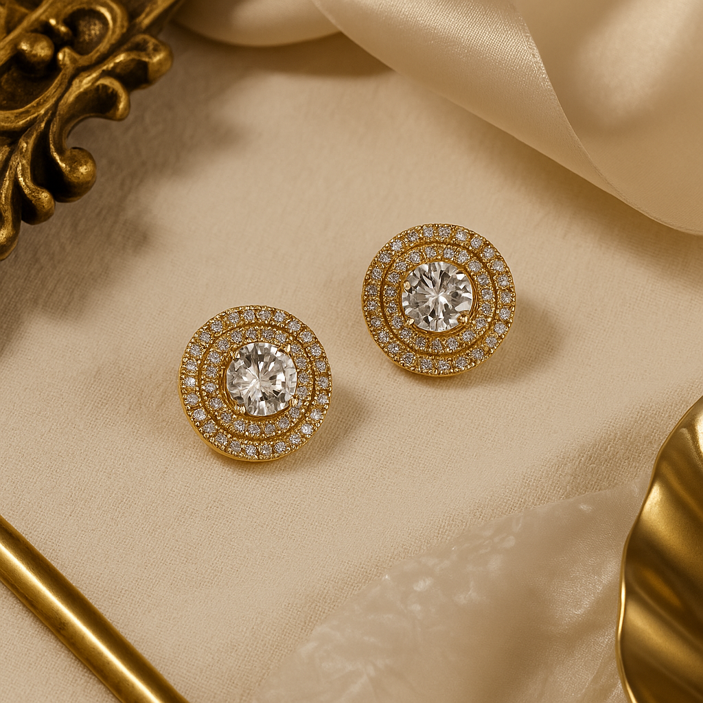 The Aurelia Halo Earrings embody timeless radiance with a regal touch. Featuring a luminous solitaire centre framed by double concentric halos of AAA grade American diamonds, these gold-toned earrings shine with brilliance from every angle. Lightweight yet striking, they are the perfect choice for weddings, festive occasions, or adding refined glamour to any ensemble.
