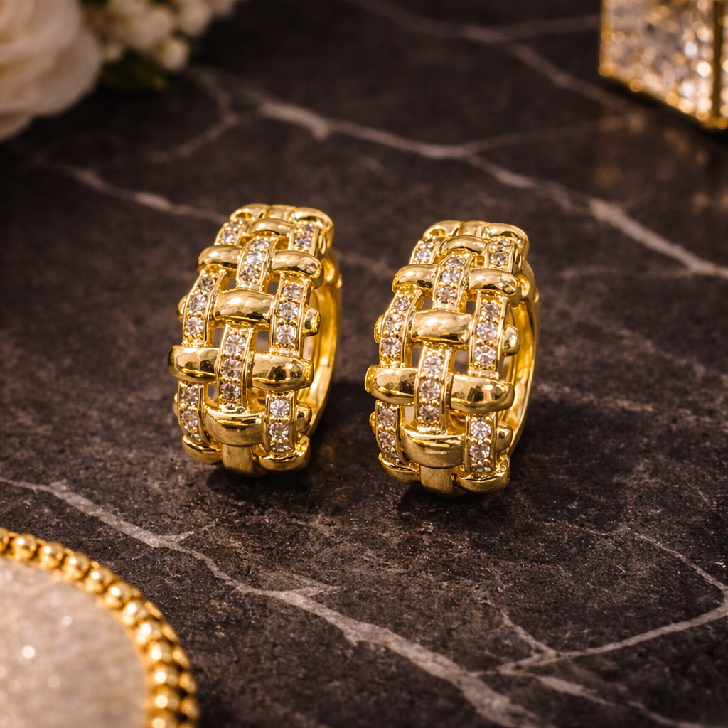 Rich in texture and refined brilliance, the Aurelle Woven Crystal Hoop Earrings are a striking expression of modern luxury. Designed with an intricate woven pattern highlighted by shimmering crystal accents, this pair brings depth, dimension, and unmistakable elegance. Finished in a radiant gold tone, these hoops are ideal for festive celebrations and statement evening looks.