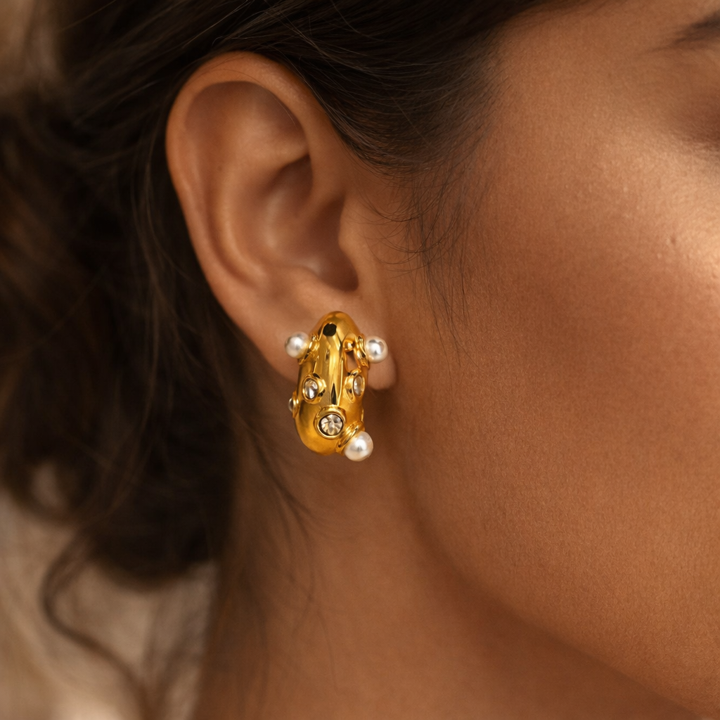 Boldly sculpted with a touch of classic charm, the Celeste Pearl Crystal Stud Earrings are designed to stand out with refined elegance. Featuring a polished gold-toned form adorned with luminous pearls and sparkling crystal accents, this pair strikes the perfect balance between contemporary design and timeless allure. Ideal for festive occasions and elevated everyday looks, these earrings add instant sophistication to any ensemble.