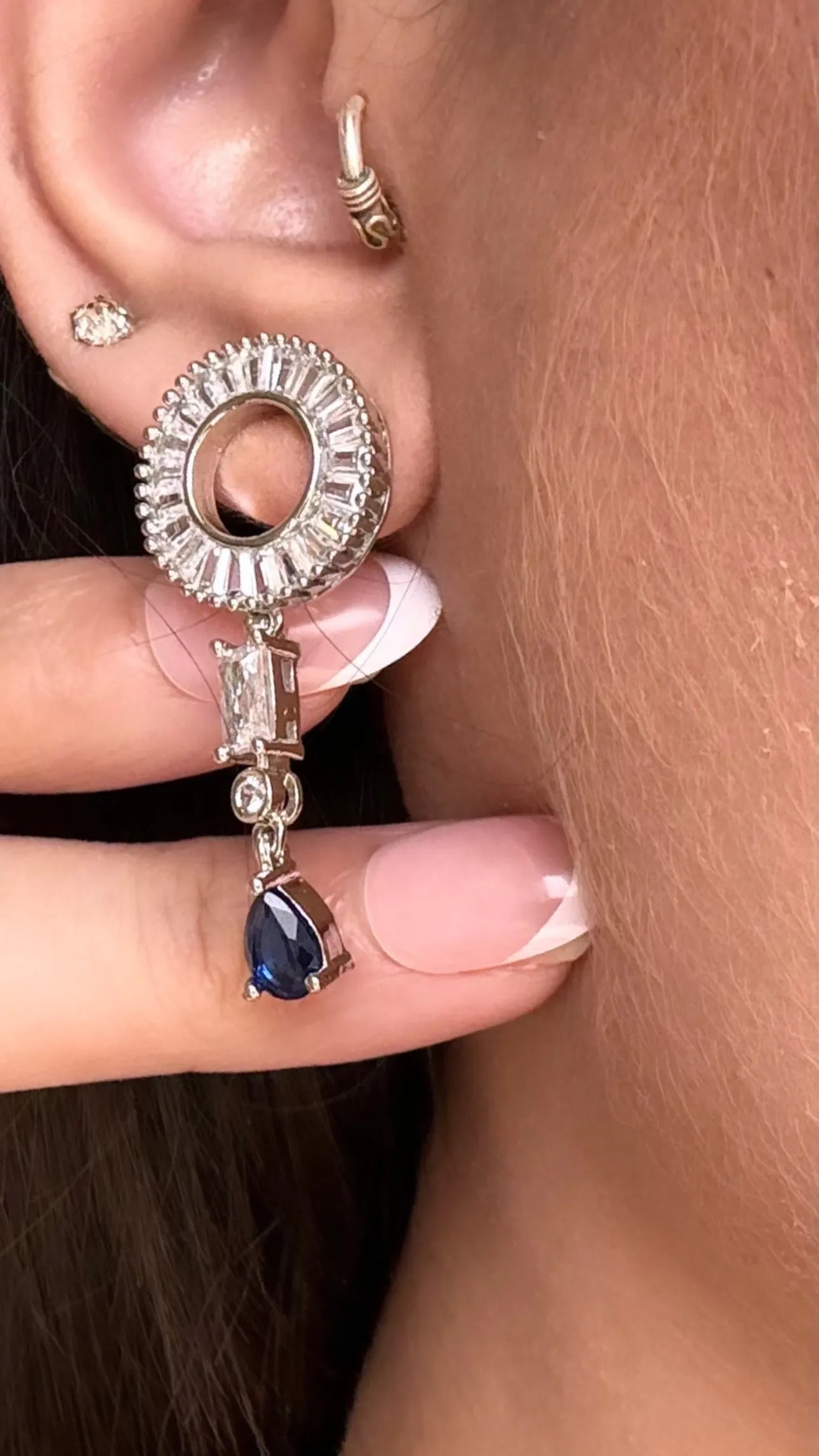 • Suspended pear-cut sapphire blue gemstones