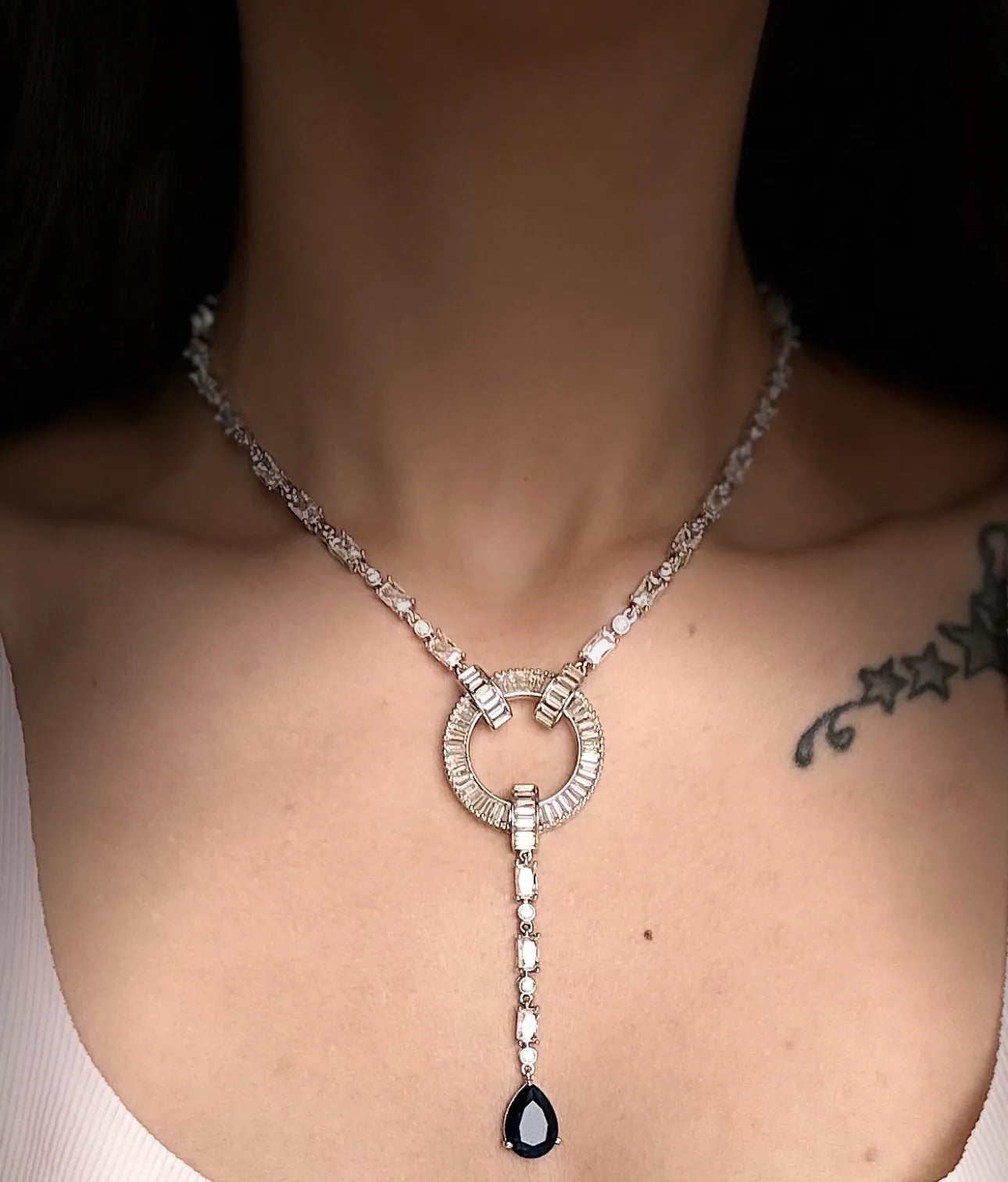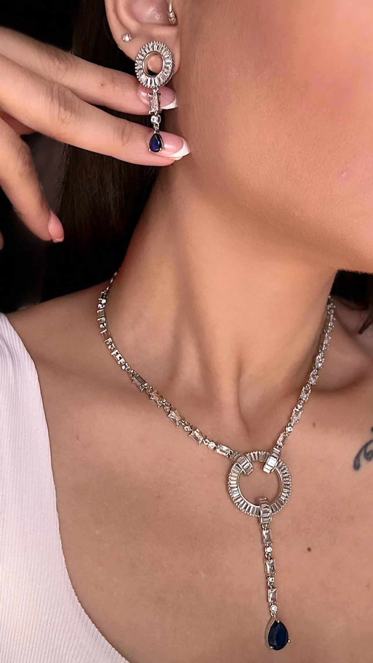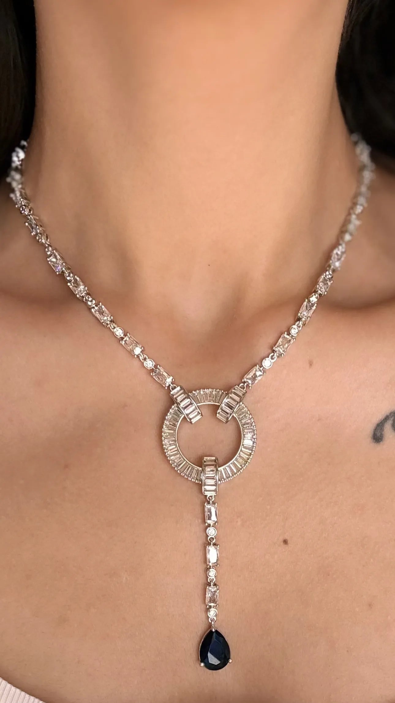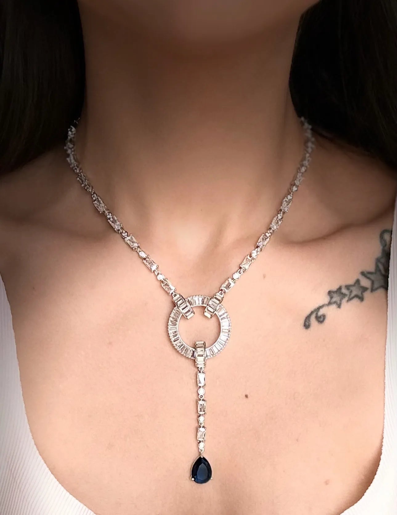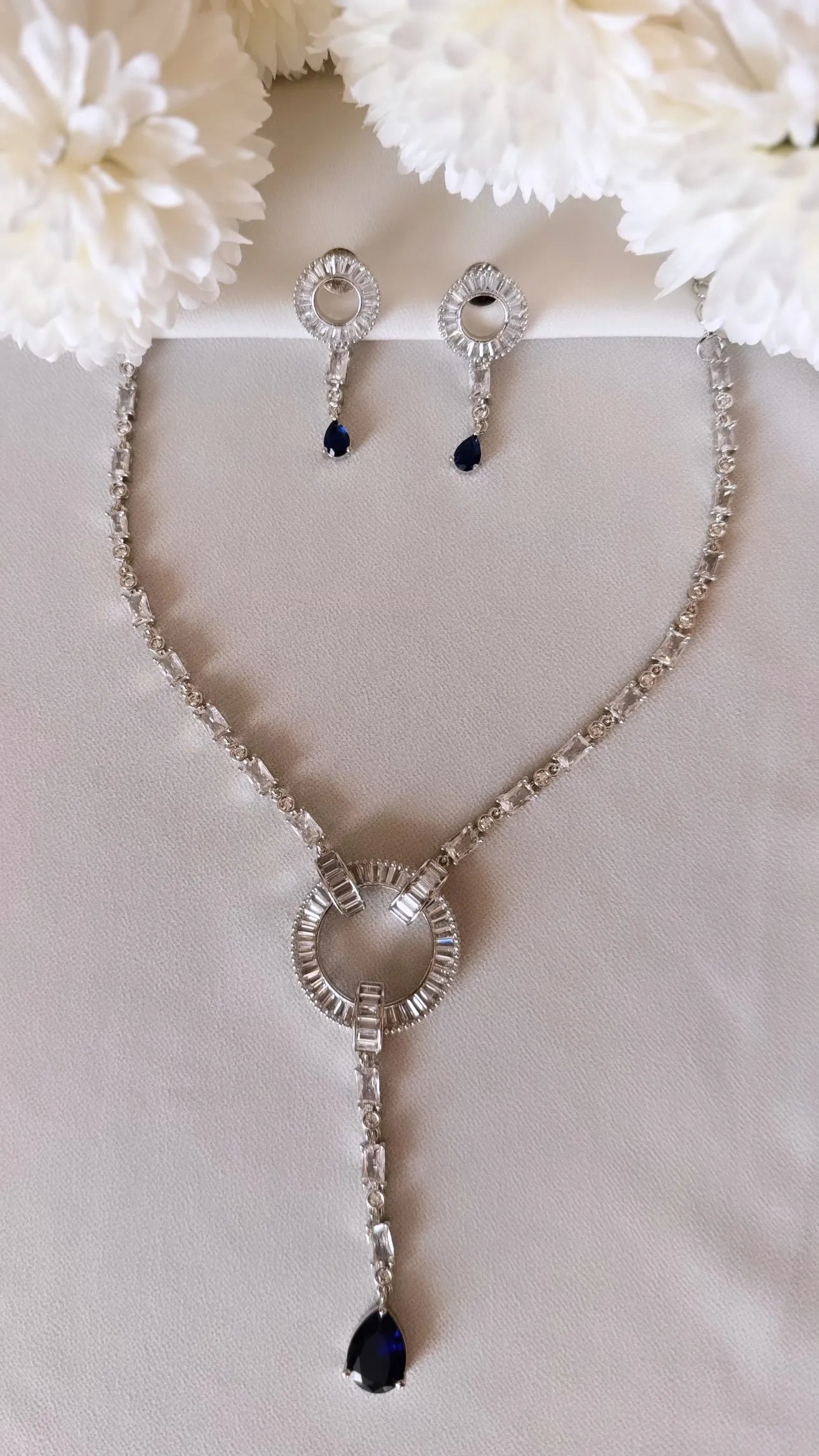 Minimal yet captivating, the Celestial Diamond Neelam Necklace Set is a modern heirloom designed to shine across generations. The necklace features a brilliant circular centrepiece surrounded by baguette-cut A-grade American diamonds, trailing down into a delicate drop of deep midnight neelam (sapphire blue) gemstones. Paired with matching earrings, this set is light, luminous, and ready for everything from cocktail evenings to intimate ceremonies. Fully waterproof and tarnish-resistant, it blends grace with durability.