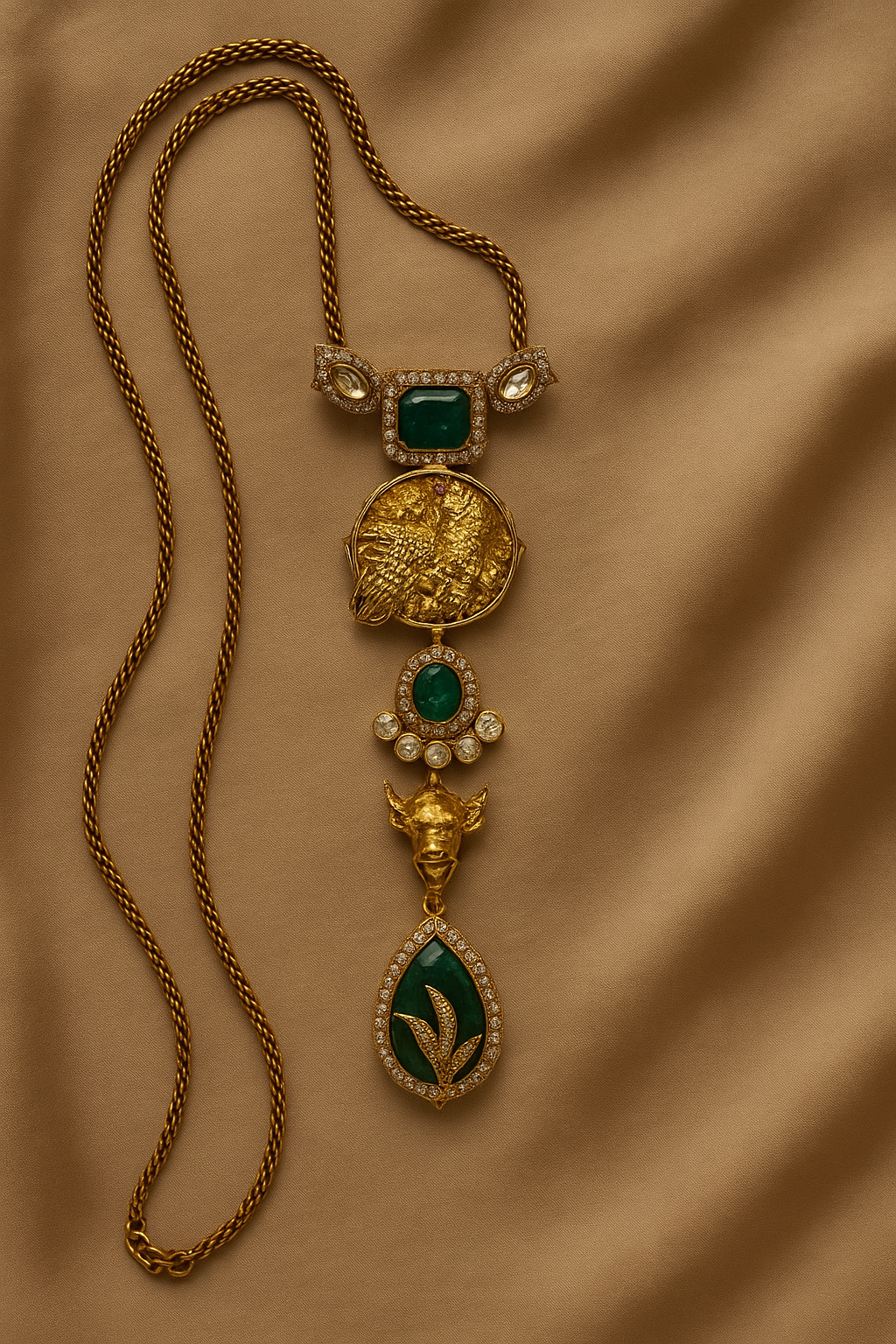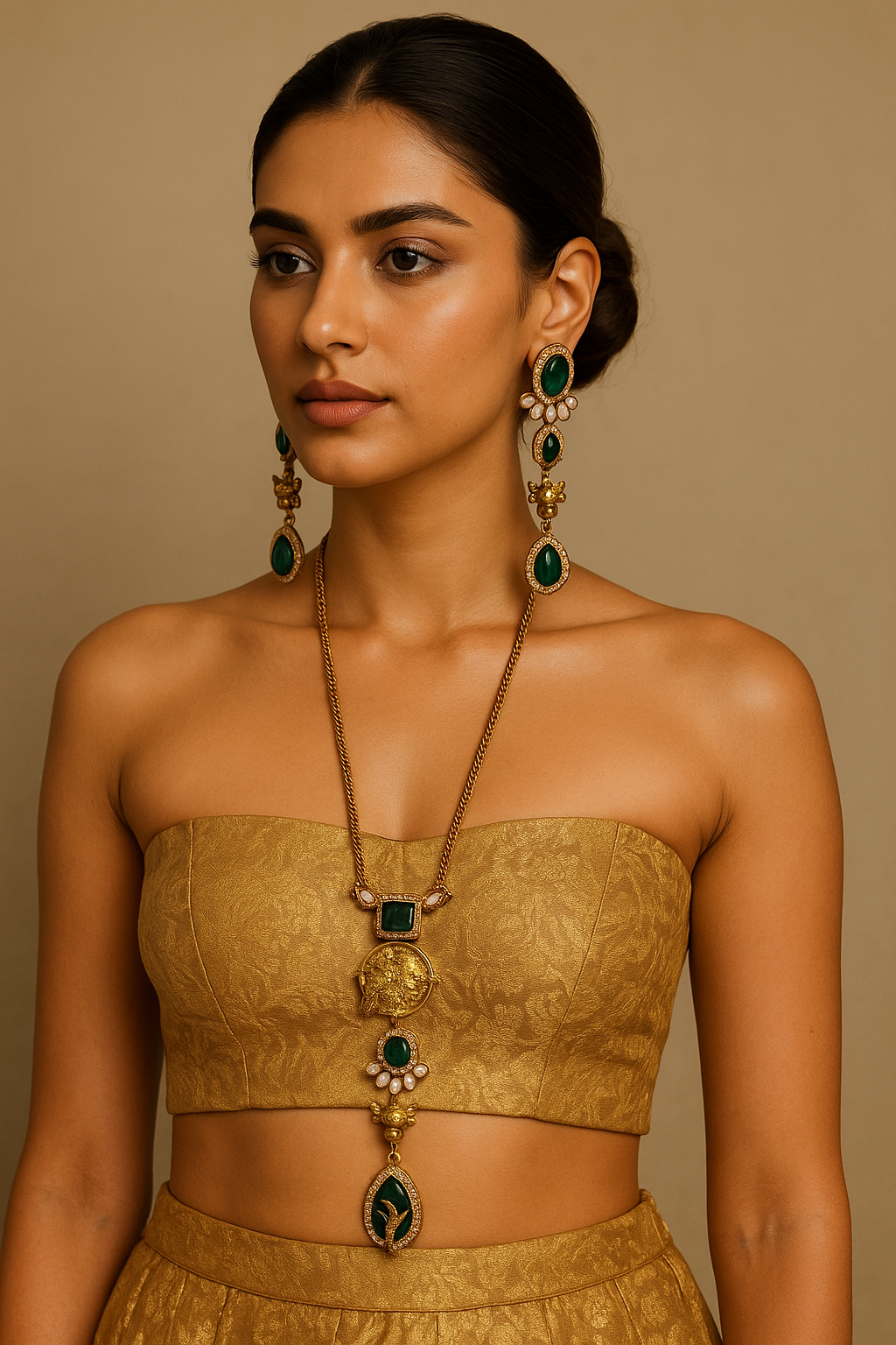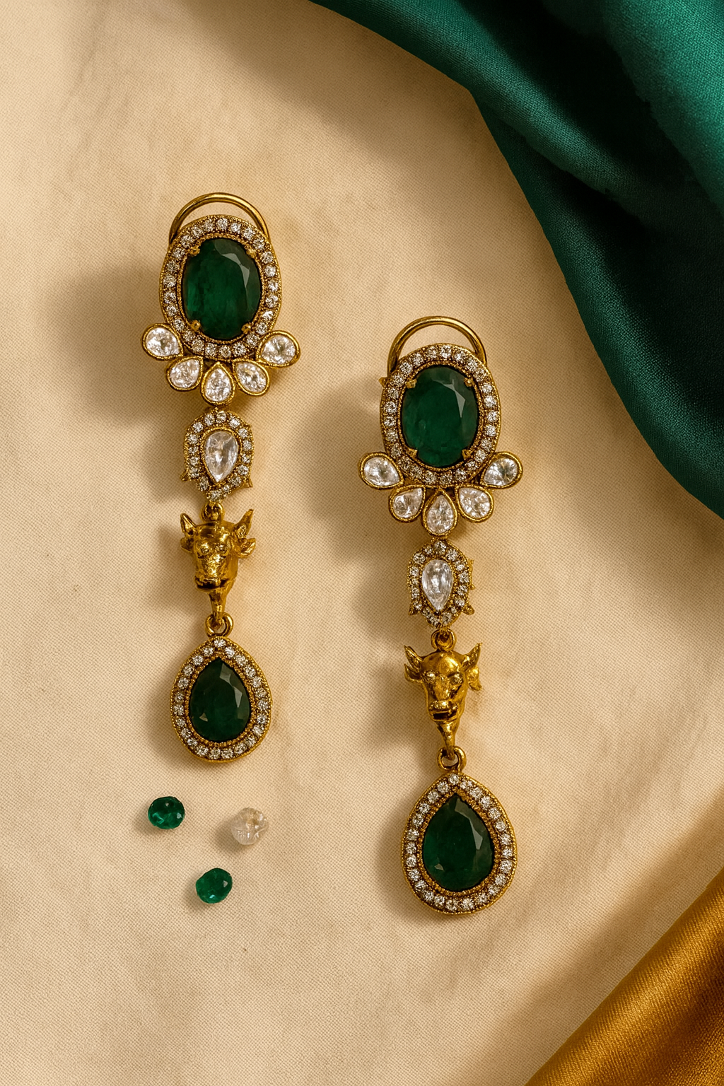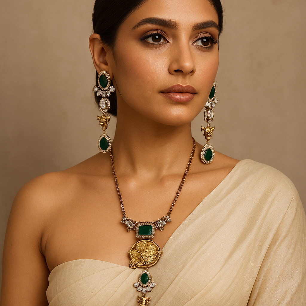 Details: Deep emerald stones with fine AD (American Diamond) halo accents Antique gold plating with intricate Nandi motif detailing Necklace with statement pendant featuring layered craftsmanship Coordinated long drop earrings included Ideal for traditional, festive & heritage occasions