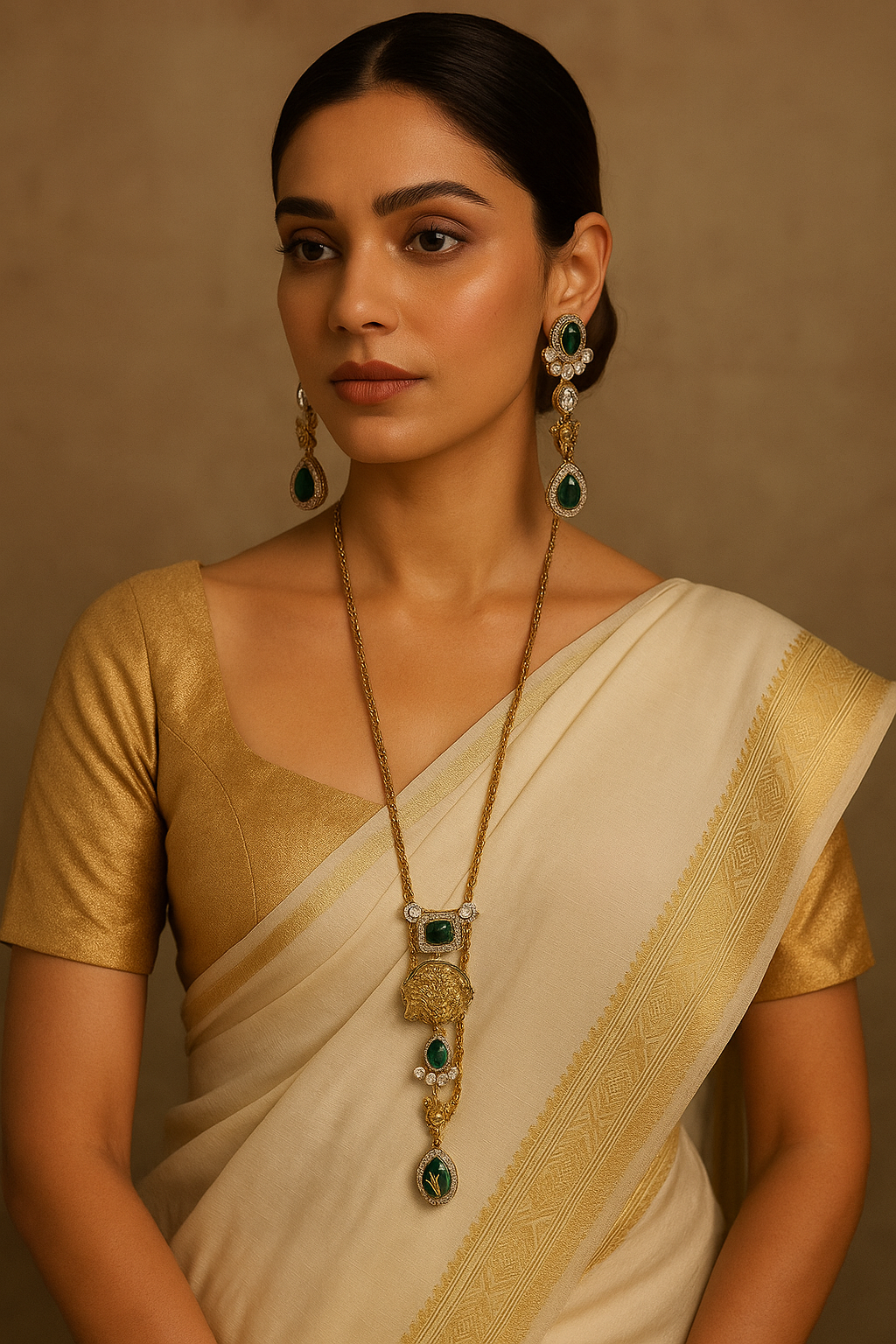 Description: Celebrate timeless tradition with this striking heritage set, featuring deep emerald-green stones framed with shimmering AD accents. The long necklace showcases a bold pendant with intricate motifs, including a sculpted Nandi and divine detailing, symbolizing strength and devotion. Paired with regal drop earrings that echo the same emerald and Nandi craftsmanship, this set is perfect for cultural occasions, temple festivities, and heritage-inspired ensembles.