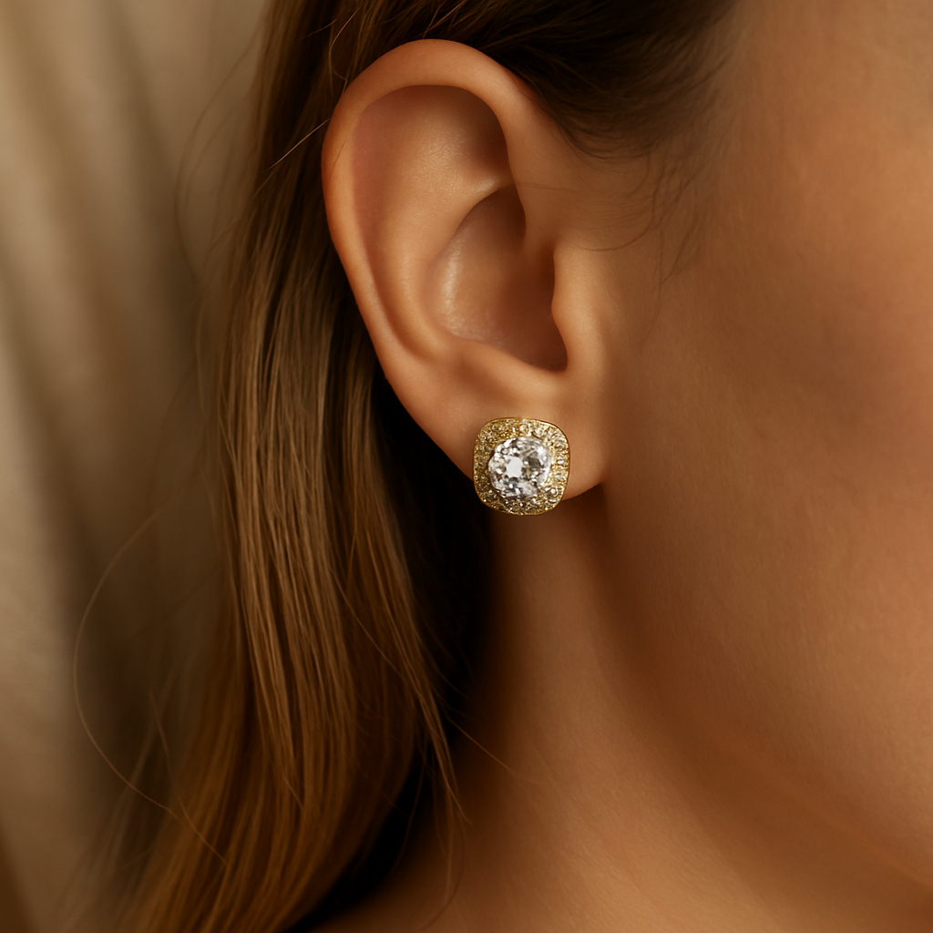 Description: A timeless classic reimagined, the Eternal Glow Solitaire Studs feature a dazzling round-cut centerpiece surrounded by a delicate halo of fine American Diamonds. Set in a sleek gold-plated square frame, these studs radiate brilliance from every angle. Perfectly versatile, they transition effortlessly from everyday elegance to evening sophistication.