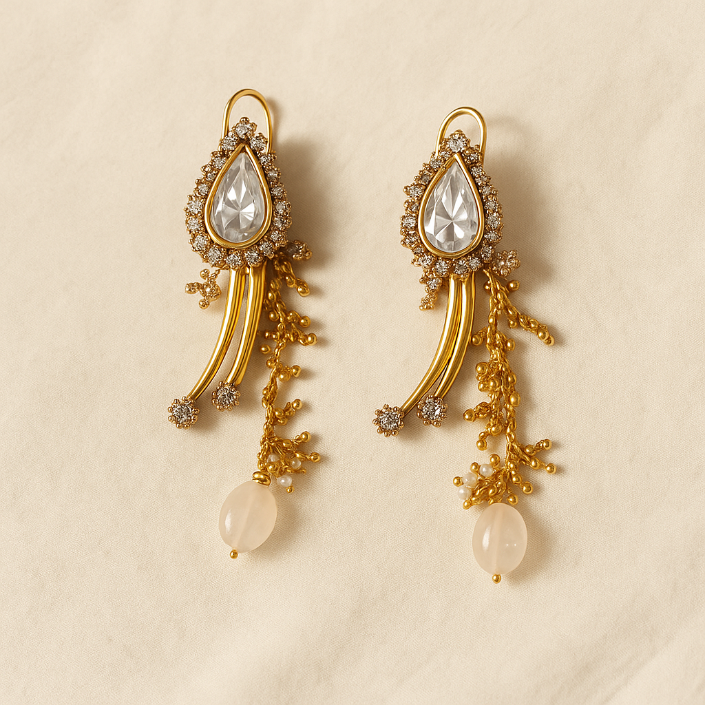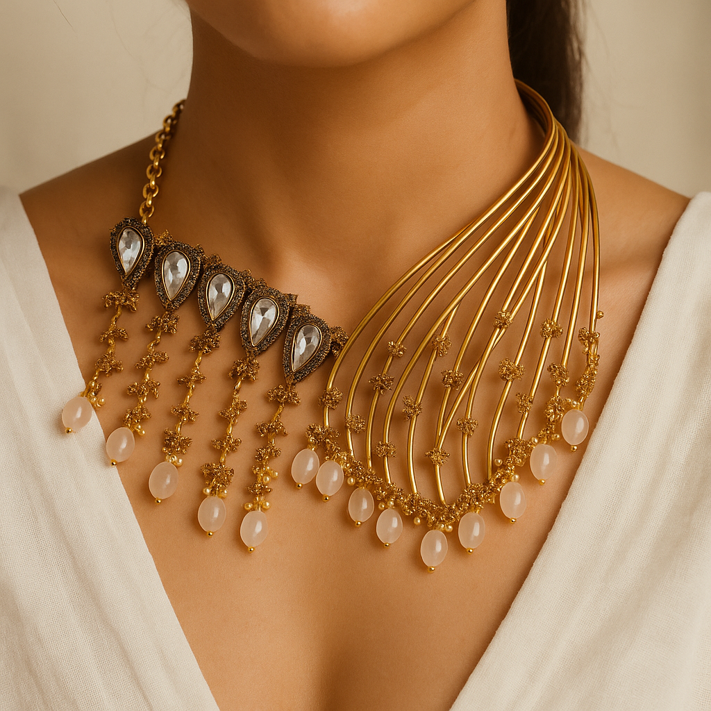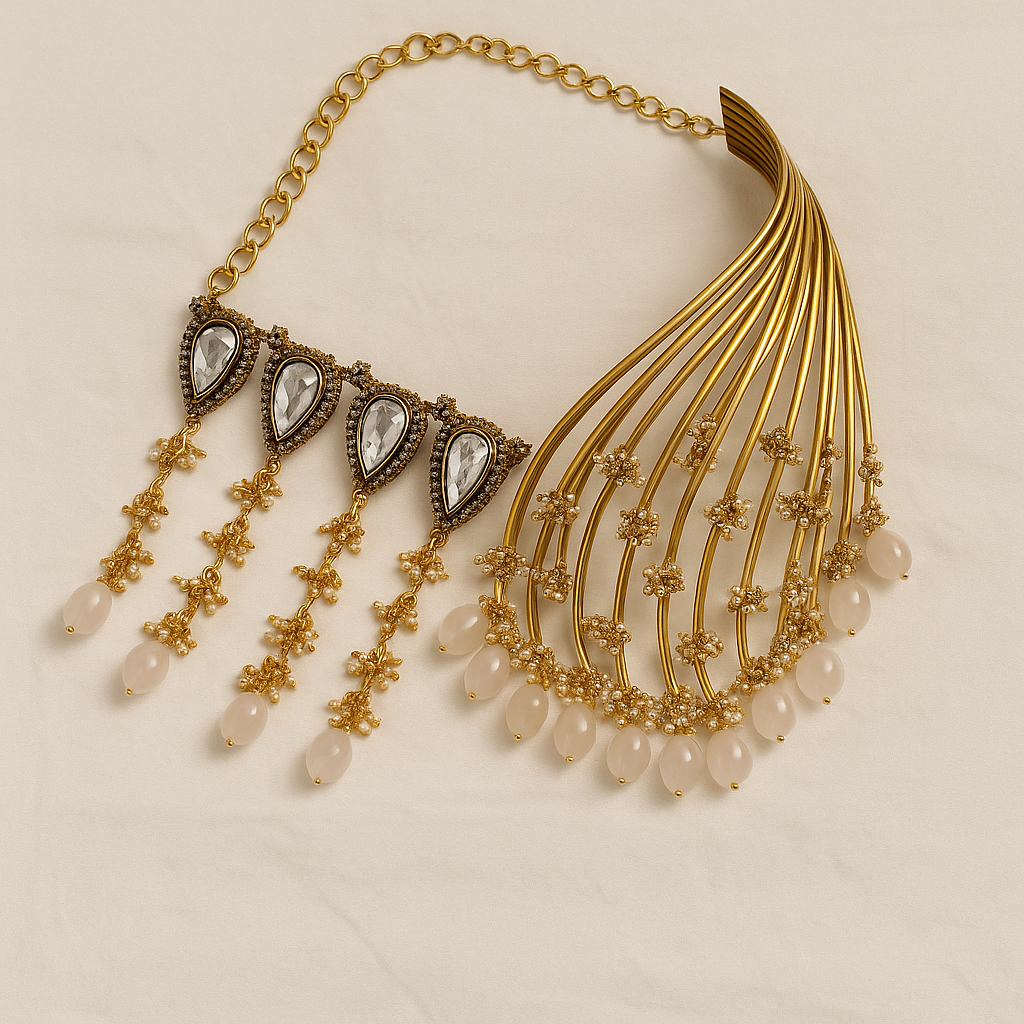 Description: A true conversation starter, the Ethereal Dual Harmony Necklace Set is a masterpiece of contemporary artistry and timeless grace. Designed with a striking asymmetrical silhouette, this necklace seamlessly blends two distinct design languages—on one side, shimmering oval polki-inspired stones framed in intricate detailing cascade into delicate golden tassels tipped with rose quartz beads; on the other, sleek golden strands weave into a sculptural drape, adorned with soft floral accents. Paired with matching statement earrings, this set beautifully balances tradition with modernity, making it perfect for weddings, soirées, and glamorous evenings.
