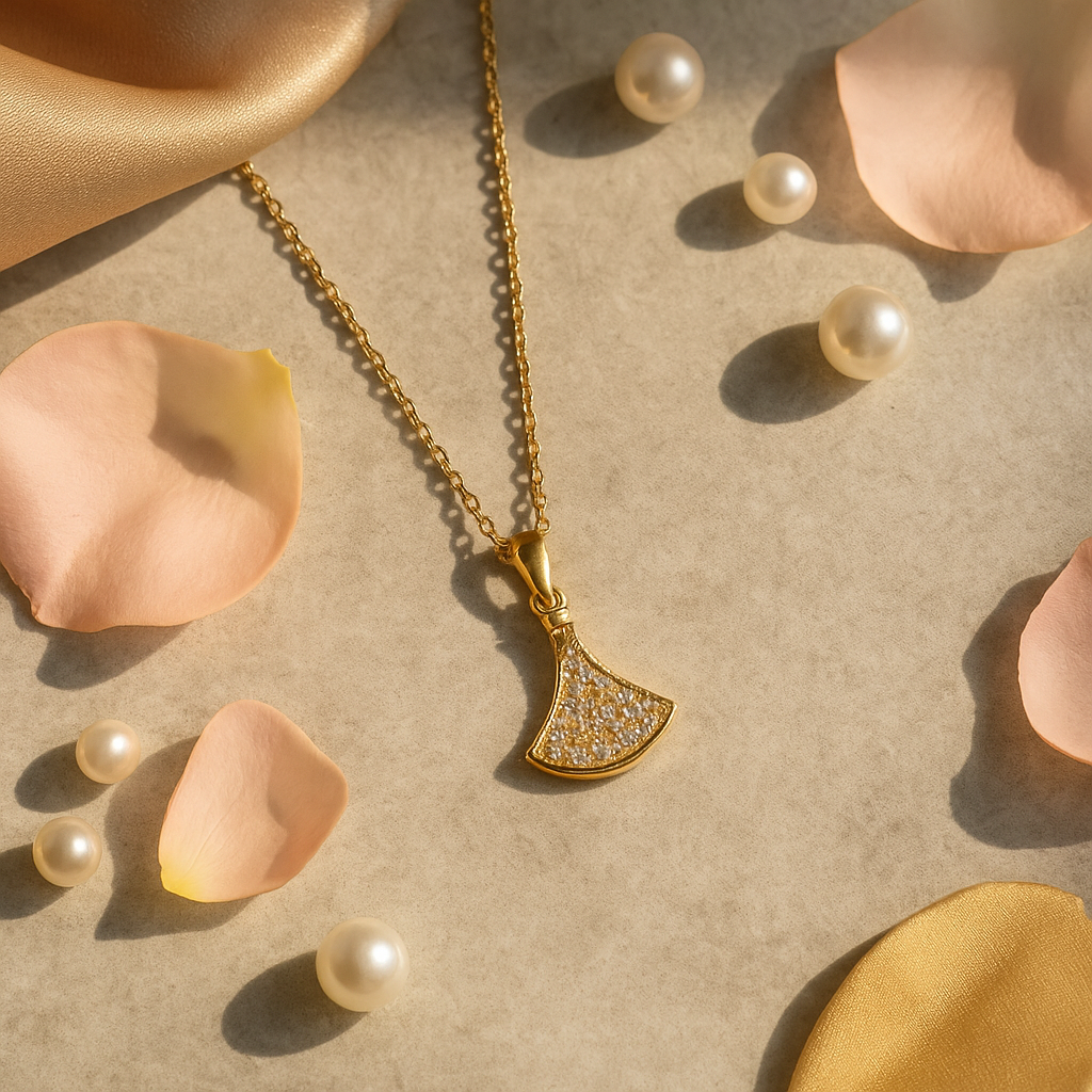 ✅ Fan-shaped pendant with sparkling cubic zirconia/crystals ✅ Adjustable gold chain (16–20 in) for versatile styling ✅ High-polish finish for a luxurious look ✅ Lightweight, elegant, and perfect for layering ✅ Long-lasting shine – does not tarnish with proper care