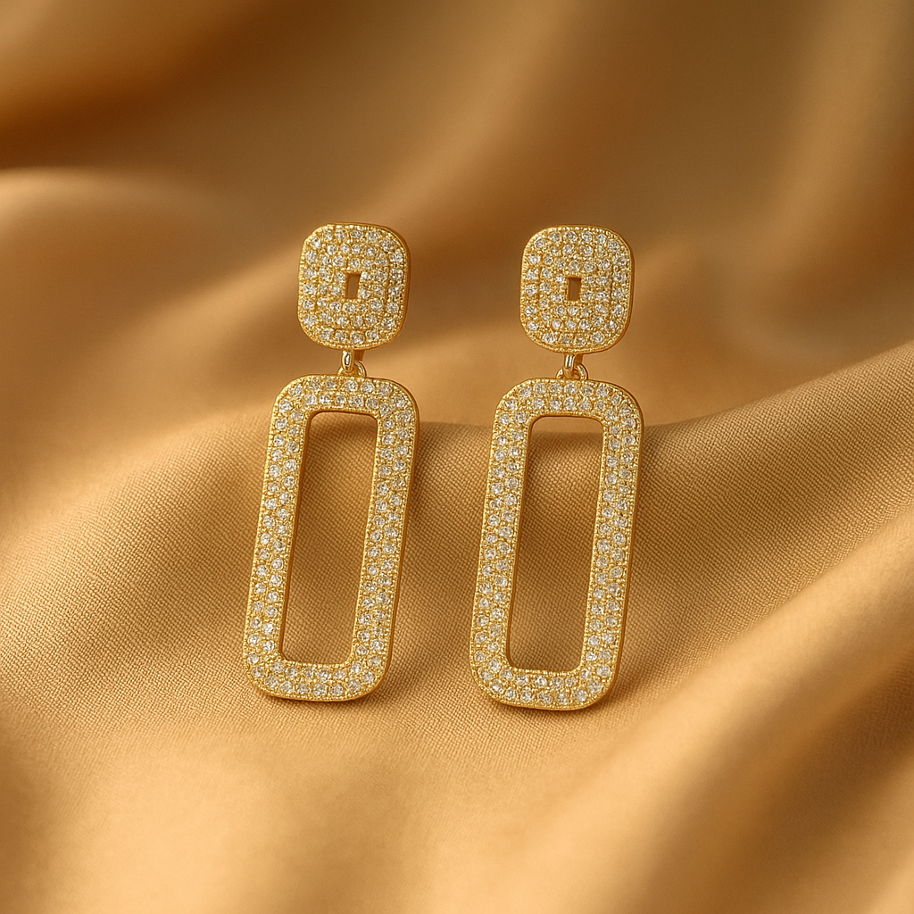 ✅ Geometric rectangular drop design with sparkling mini stones ✅ Polished gold-plated finish for a luxurious touch ✅ Lightweight and comfortable for long wear ✅ Perfect for parties, evening outings, and festive occasions