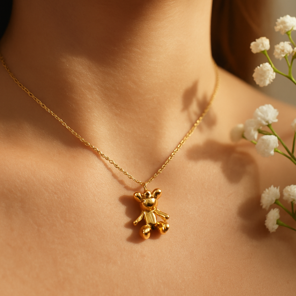Metal: Premium brass/stainless steel with gold plating Pendant: 3D teddy bear charm Chain: Adjustable chain with secure clasp