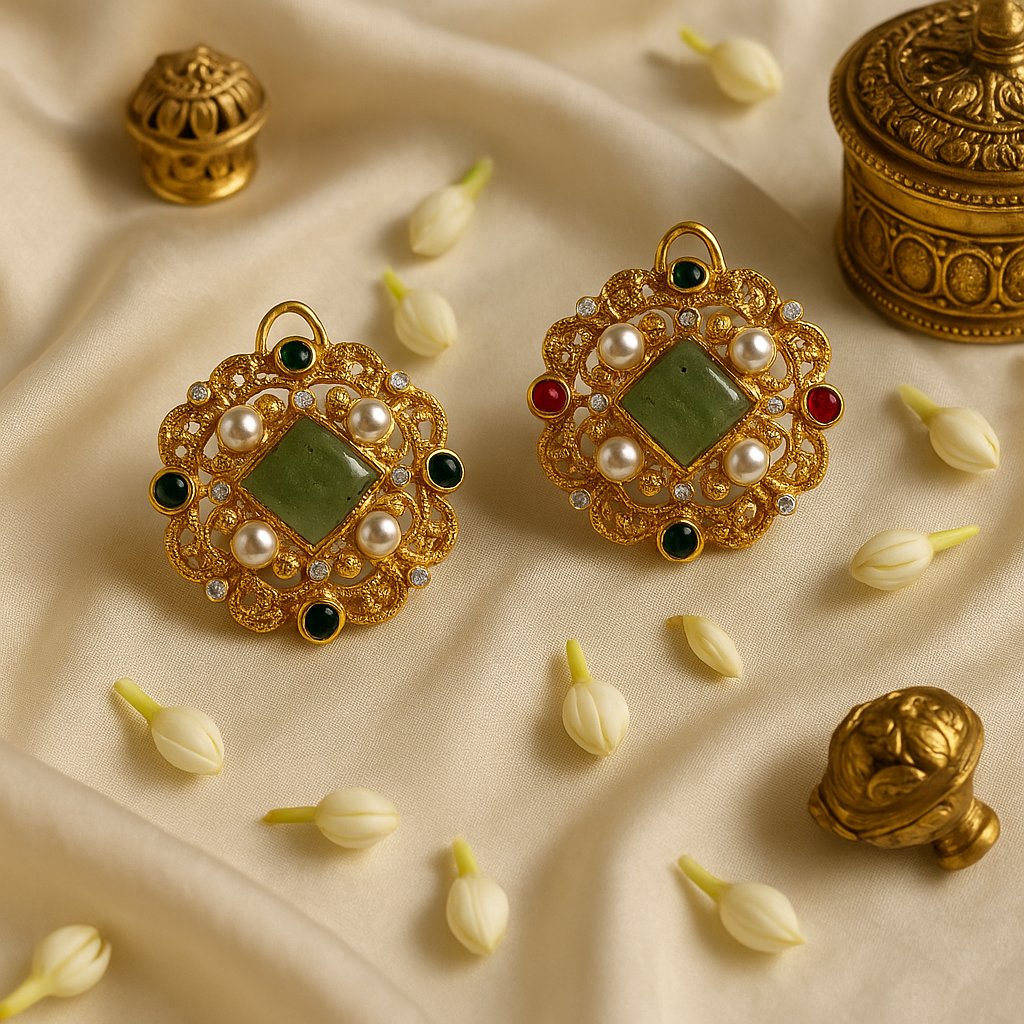 Description: Step into timeless elegance with our Heritage Polki & Pearl Choker Set, crafted to celebrate the beauty of traditional artistry. This regal set features an ornate choker adorned with square-cut green stones, lustrous pearls, and delicate polki-style ADs, finished in antique gold plating. The matching earrings mirror the same grandeur, making it a perfect ensemble for weddings, festive celebrations, and cultural occasions.
