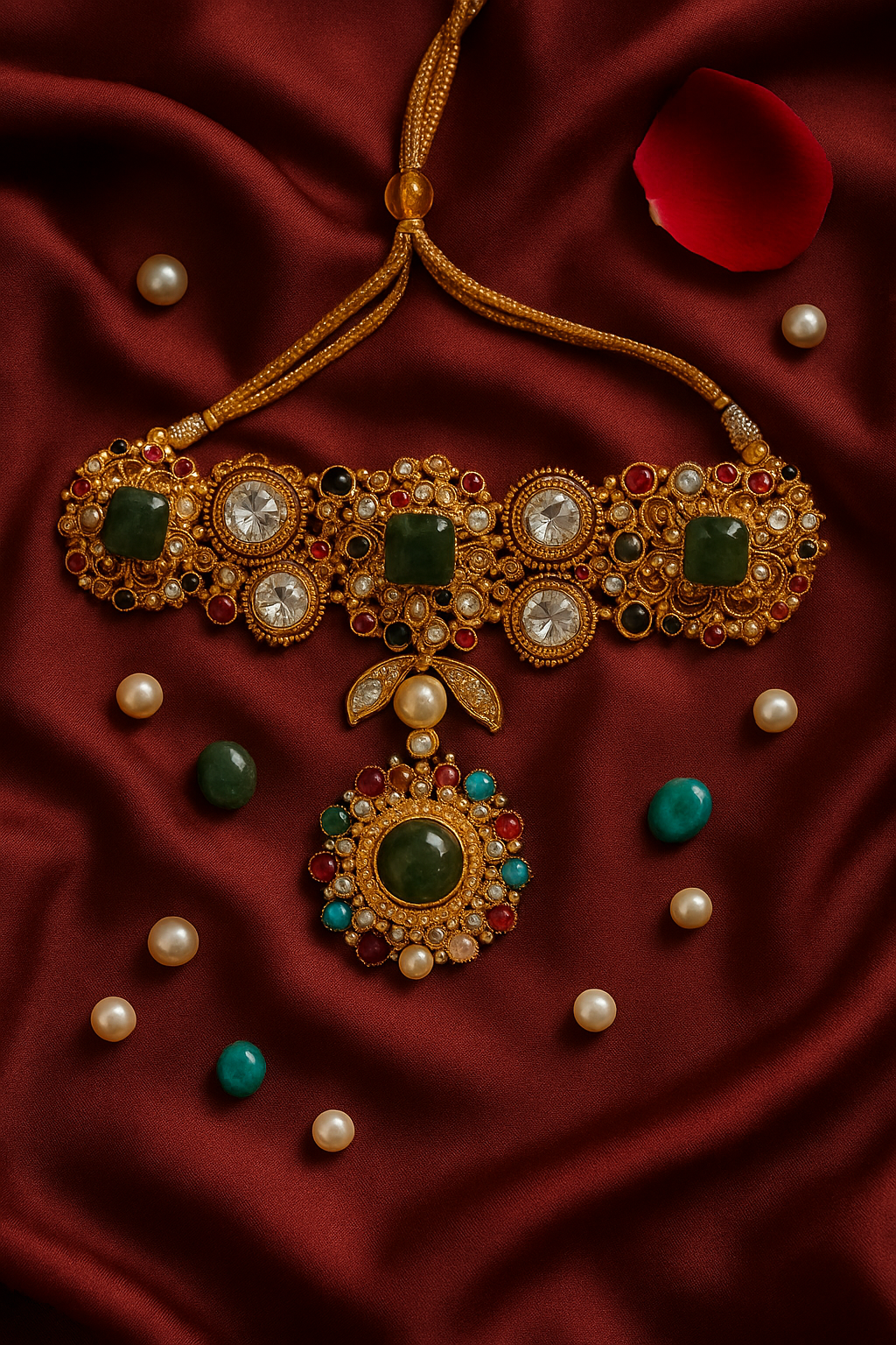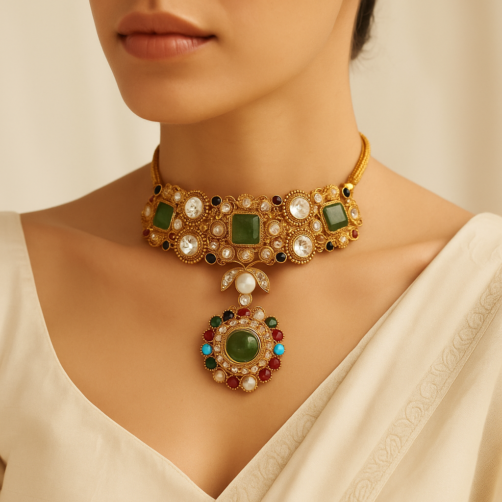 Details: Intricately handcrafted choker with square green stones and polki-style accents Embellished with pearls, kundan-inspired detailing, and vibrant multicolour highlights Matching statement earrings included Adjustable tie-up closure for comfort Ideal for bridal wear, festive gatherings & heritage-inspired styling