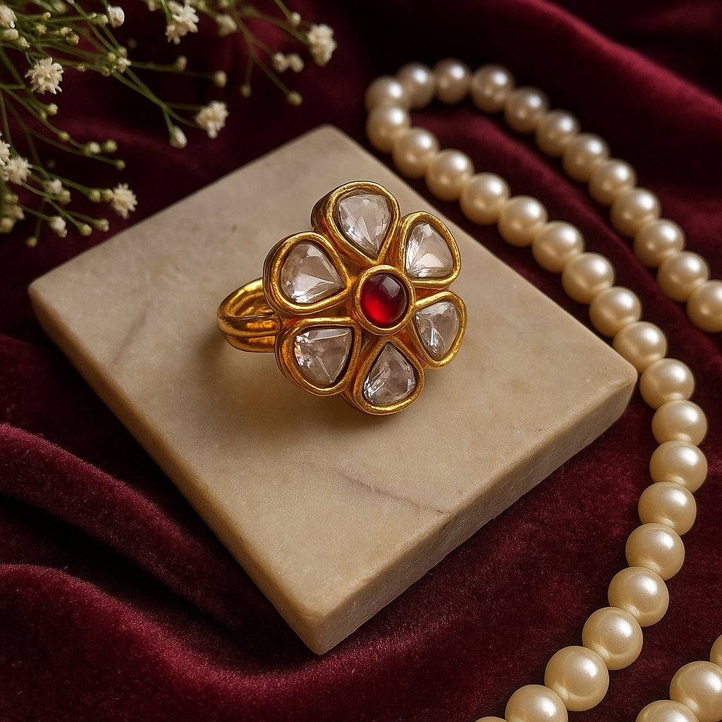 Minimal in structure, majestic in presence, the Kumud Kundan Ruby Ring is a handcrafted statement inspired by vintage Indian florals. Featuring six kundan petal stones encircling a deep red centerpiece, this gold-plated ring is waterproof, tarnish-resistant, and brings the perfect blend of tradition and bold charm to any festive look.