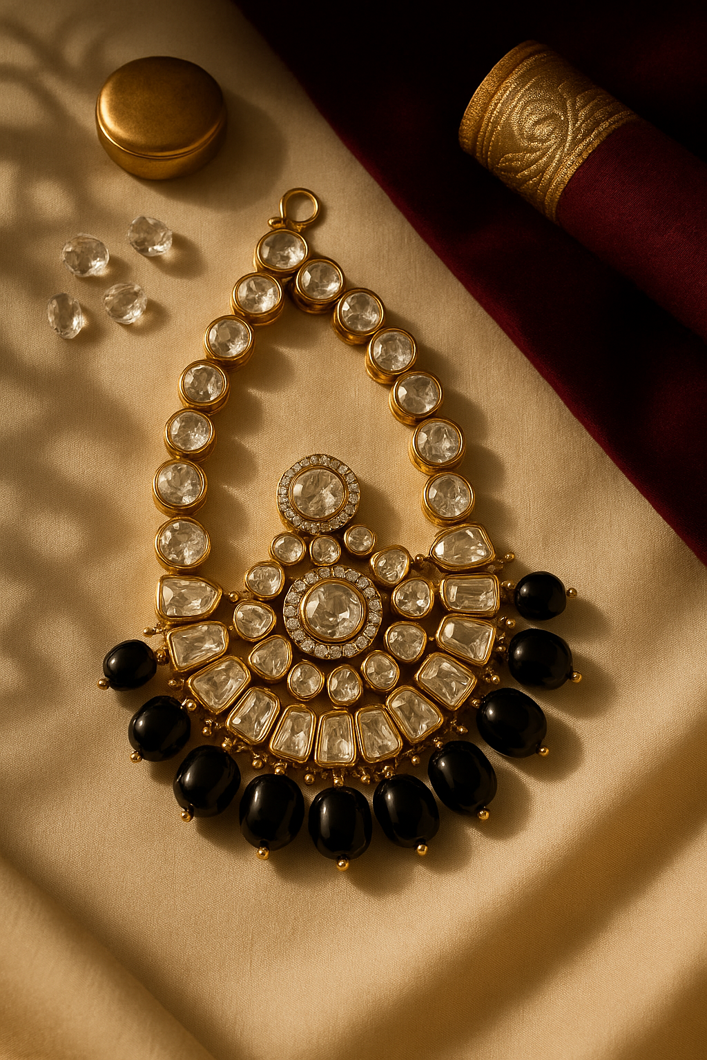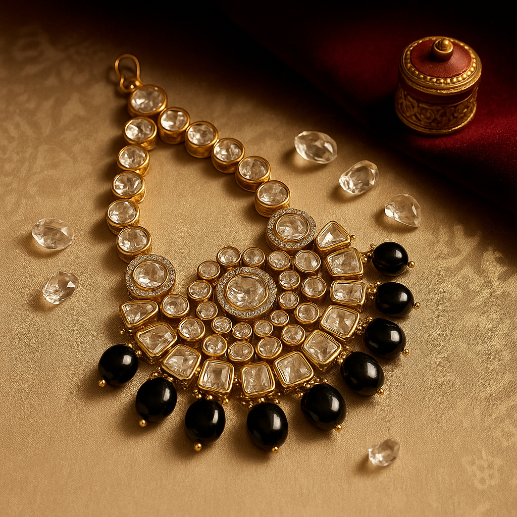 Elevate your bridal or festive look with this exquisite Kundan & Onyx Passa, a timeless piece inspired by royal Mughal heritage. Handcrafted with uncut kundan stones and finished with lustrous black onyx drops, it drapes beautifully along the temple to add drama and grace to any ensemble. Perfect for brides or wedding guests who want to make a statement of elegance and tradition.