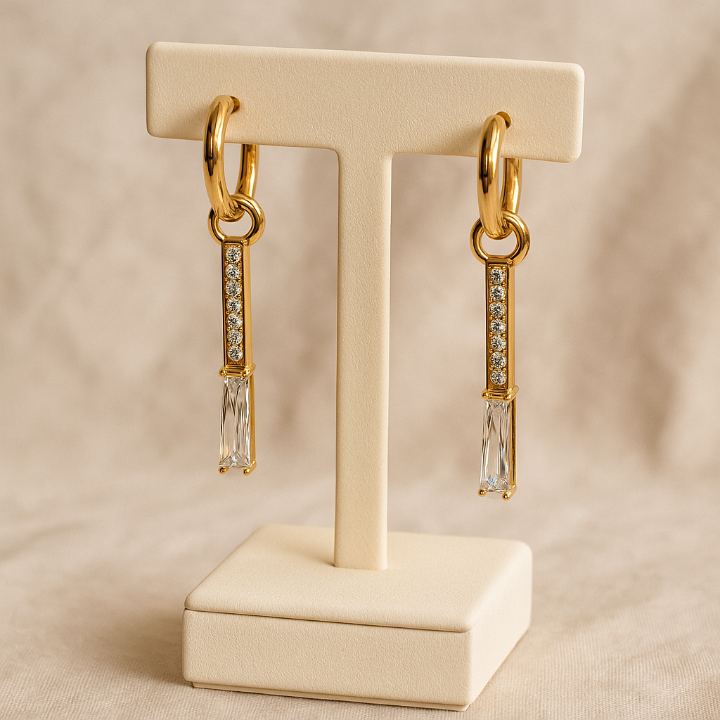 Delicate yet striking, the Luna Linear Diamond Drops embody understated glamour and timeless sophistication. Crafted in polished gold, each earring features a vertical line of shimmering diamonds leading to a baguette-cut drop that catches the light with graceful movement. Sleek, minimal, and versatile Ñ theyÕre designed to elevate both everyday and evening looks with effortless radiance.