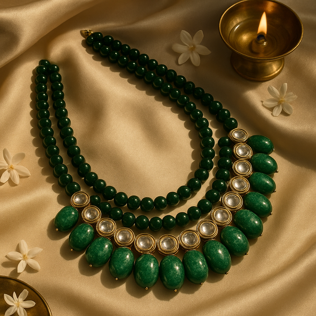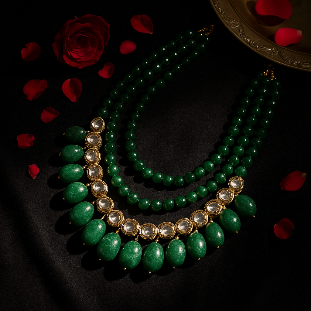 Channel unapologetic royalty with our Maharani Malhar Emerald Polki Necklace, a layered masterpiece that blends deep emerald elegance with radiant polki brilliance. This gold plated , waterproof, and tarnish-resistant statement piece features bold green emerald beads, luxe polki-style A-grade American diamonds, and a regal stacked design that commands attention. A flawless pick for modern-day queens.