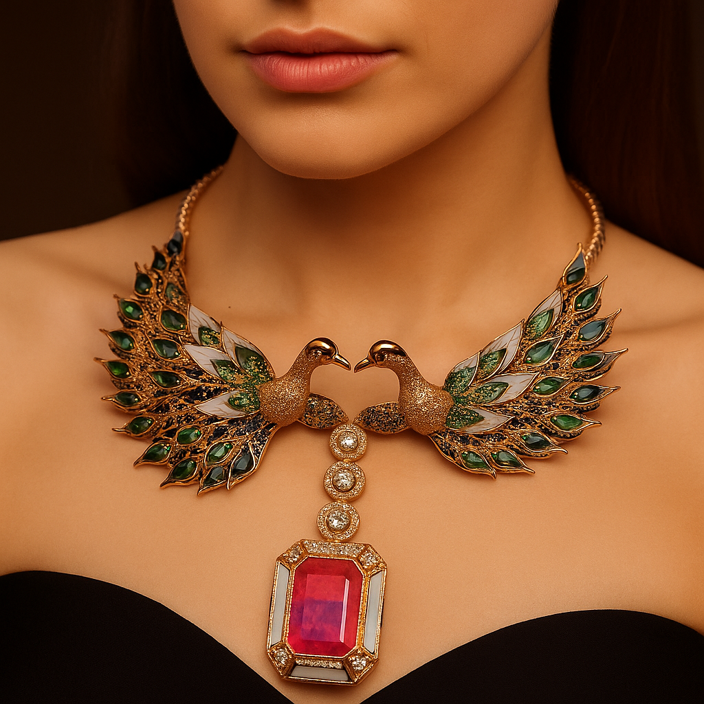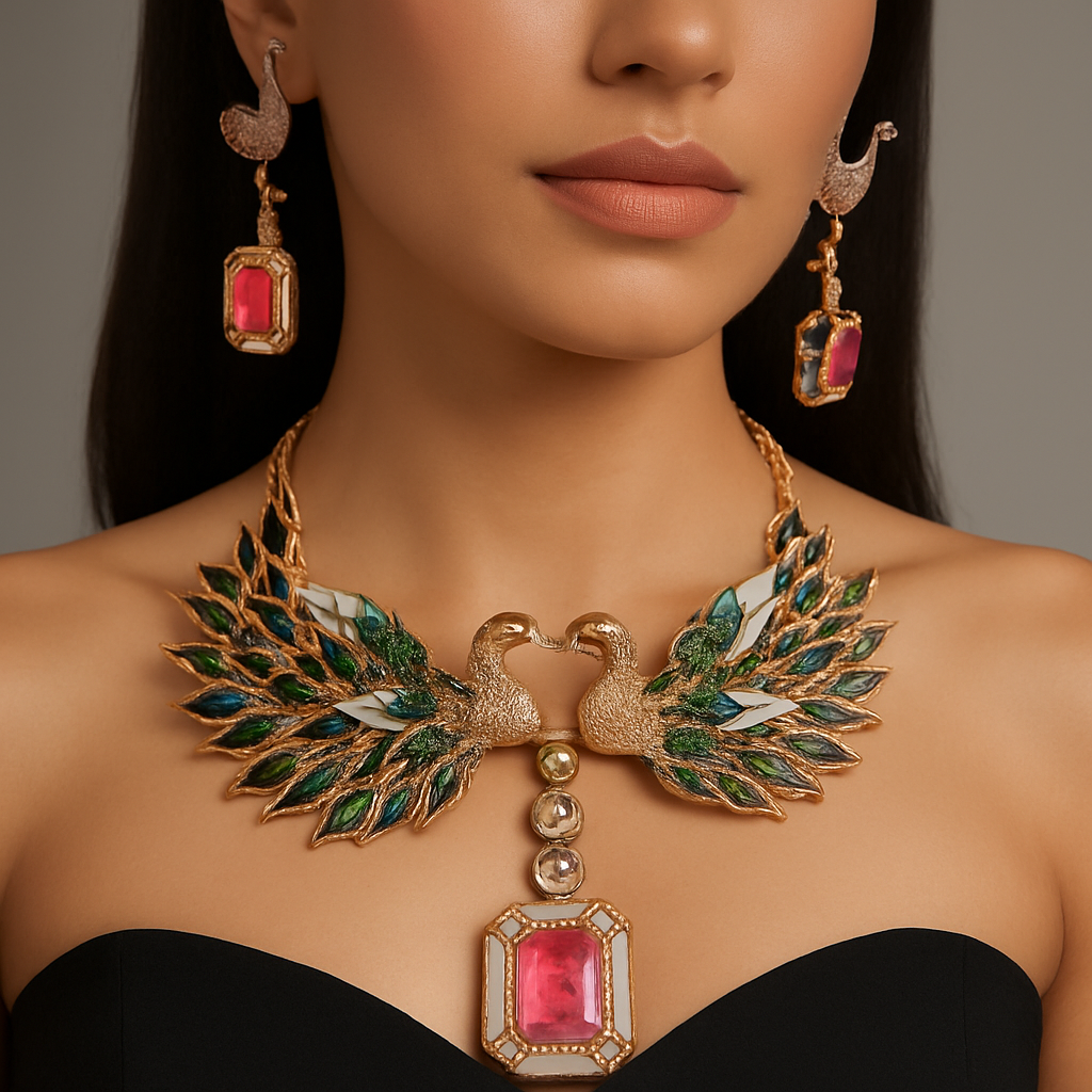 Details: Gold-plated statement necklace with twin peacock motif Wings embellished with green enamel, AD stones, and fine detailing Centerpiece drop with radiant ruby-red gemstone and halo of AAA-grade American Diamonds Adjustable fit for comfort and styling versatility Perfect for bridal, festive, or royal-inspired looks