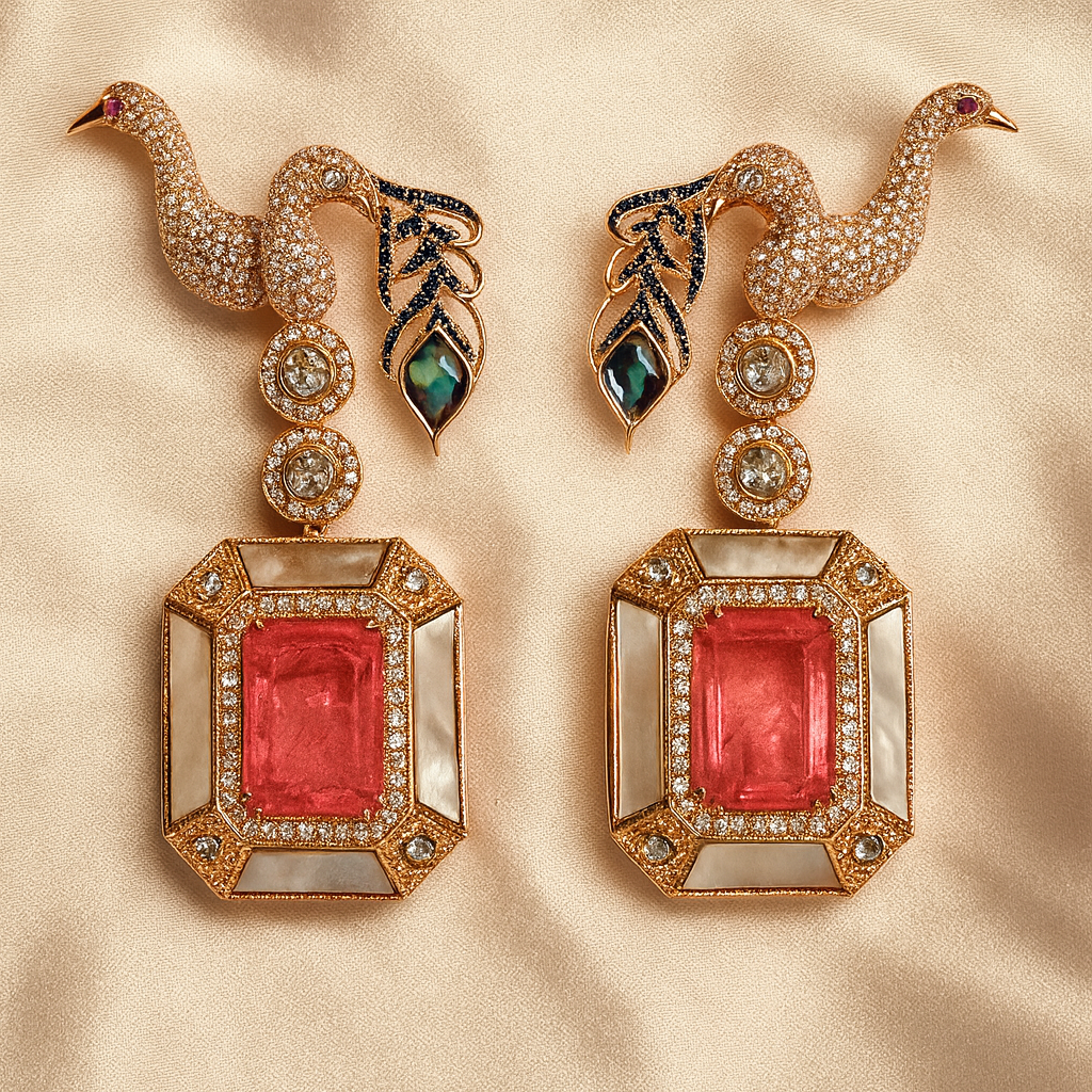 Description: Command attention with the Majestic Peacock Harmony Necklace, a masterpiece of artistry and grandeur. Featuring two intricately crafted golden peacocks with wings adorned in shimmering green enamel, sparkling stones, and delicate white accents, this necklace embodies elegance and regality. At its heart, a bold ruby-red gemstone pendant framed with dazzling American Diamonds cascades from a trio of shimmering circular motifs, adding a striking focal point. This statement piece is perfect for weddings, festive occasions, and moments when you want to shine with unmatched grace.