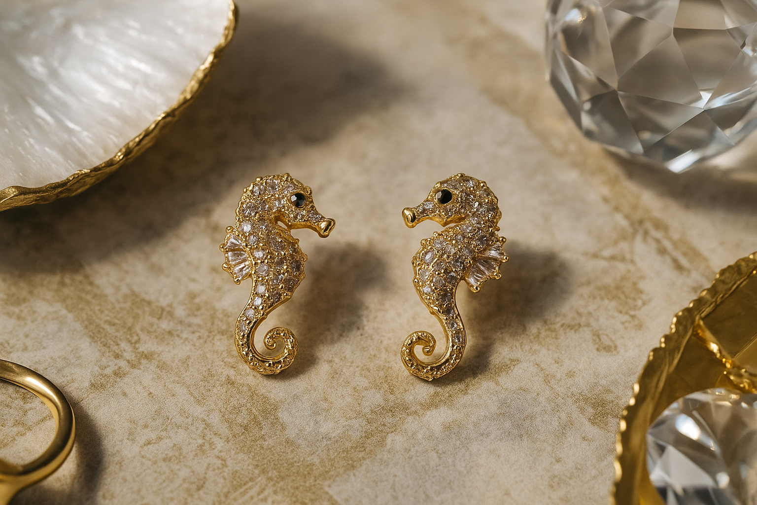 The Marina Seahorse Earrings celebrate the beauty of the ocean with a touch of regal elegance. Crafted in a radiant gold-toned finish and encrusted with AAA grade American diamonds, these seahorse-shaped earrings exude charm and sophistication. Lightweight yet striking, they are perfect for festive occasions, gifting, or adding a unique sparkle to your everyday elegance.