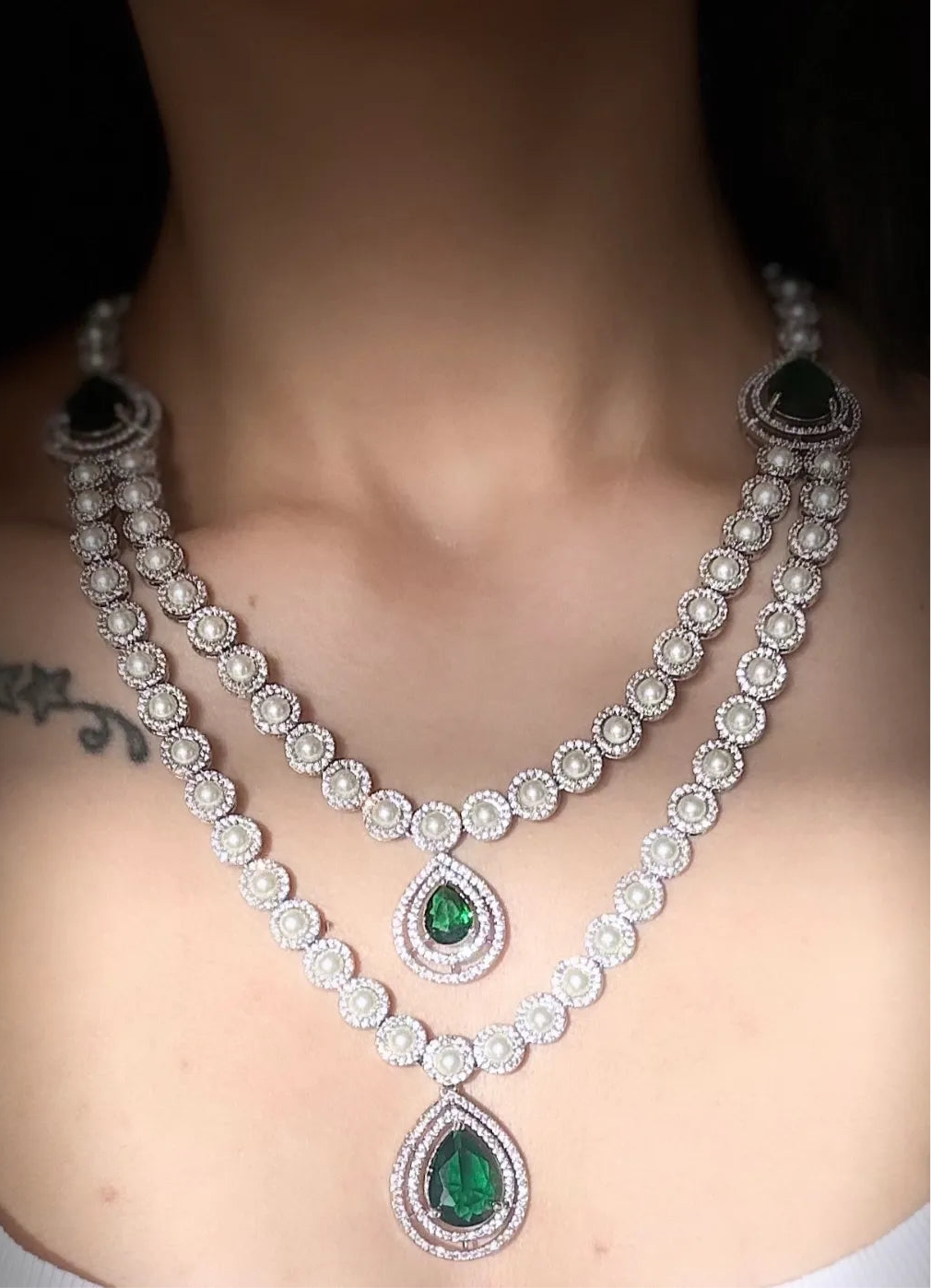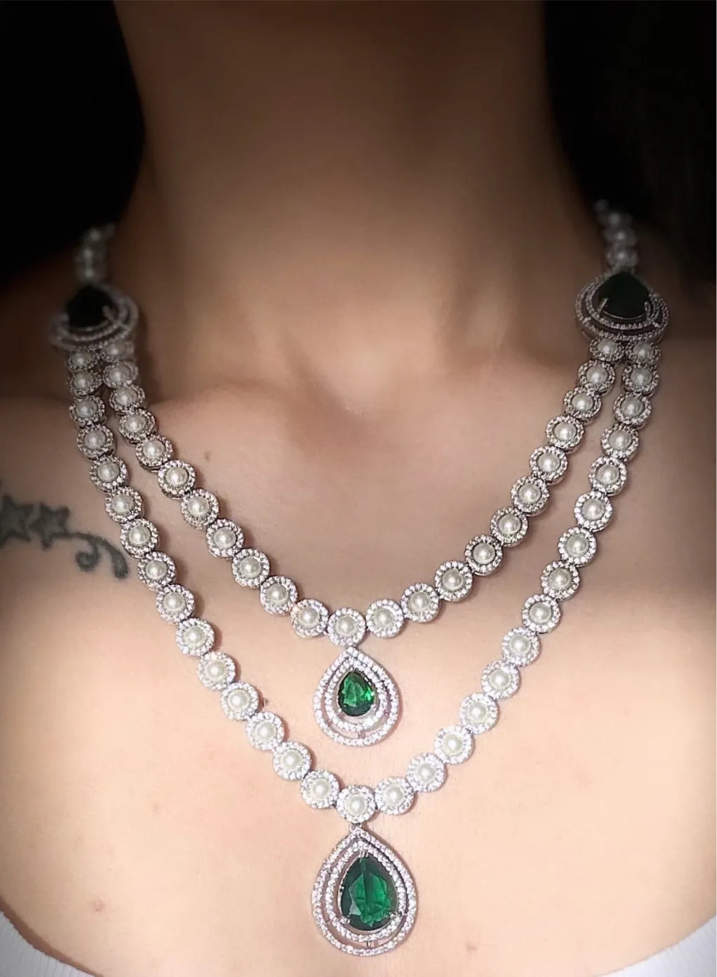 Where classic elegance meets bold sophistication, the silver Pearl Empress Emerald Set brings together vintage-inspired detailing and contemporary shine. Crafted on a silver base, this exquisite set features double-layered pearl-studded chains paired with deep emerald green teardrop stones, all bordered in radiant A grade American diamonds. A perfect harmony of grace and grandeur, this set is waterproof, tarnish-resistant, and does not lose shine or colour, making it your forever favourite for every celebration.