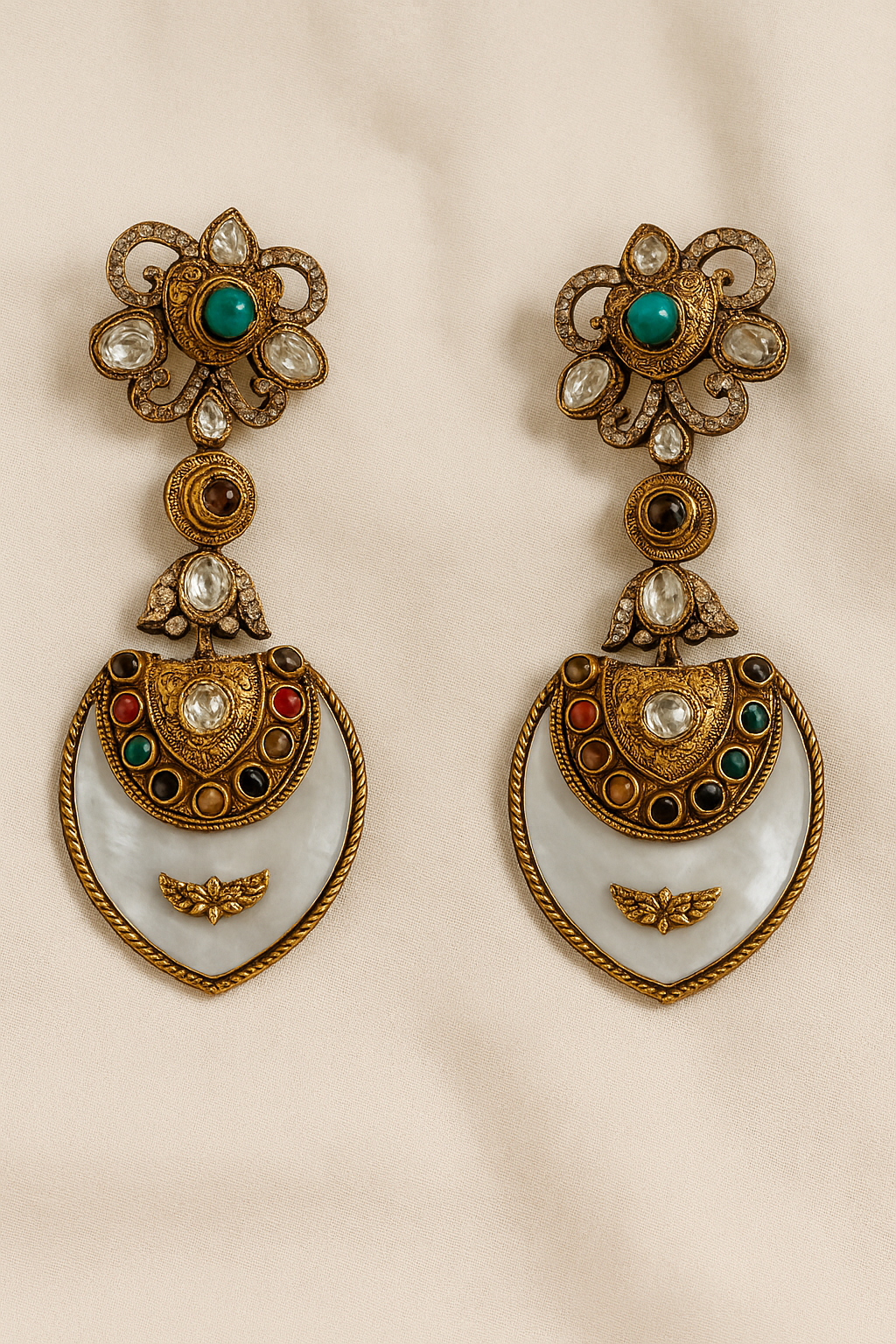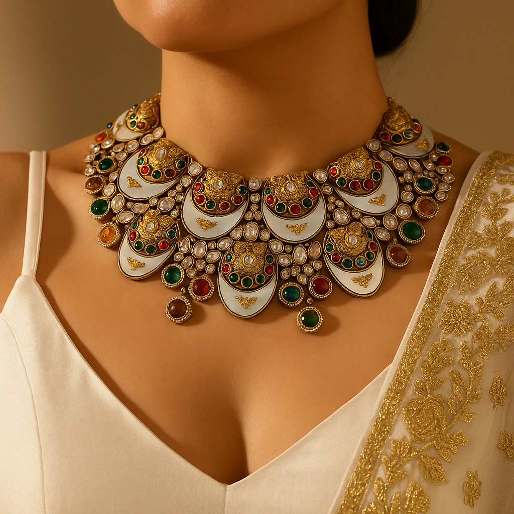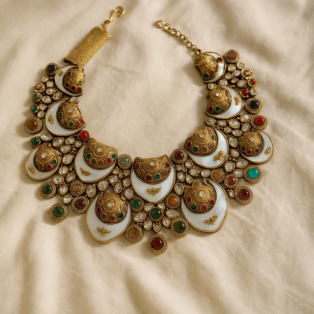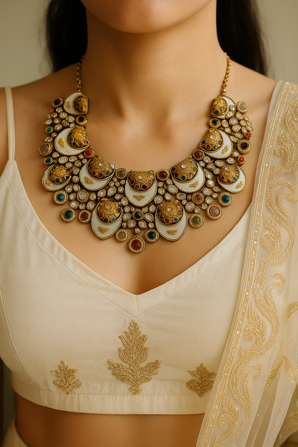 Details: Crescent-shaped motifs with kundan & enamel work Multi-coloured stone accents for a royal touch Fine AD embellishments for sparkle Matching ornate earrings included Perfect for bridal, festive, and heritage looks