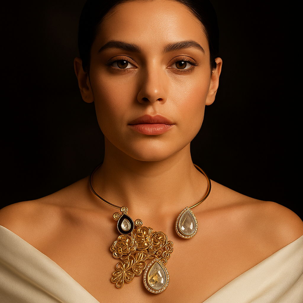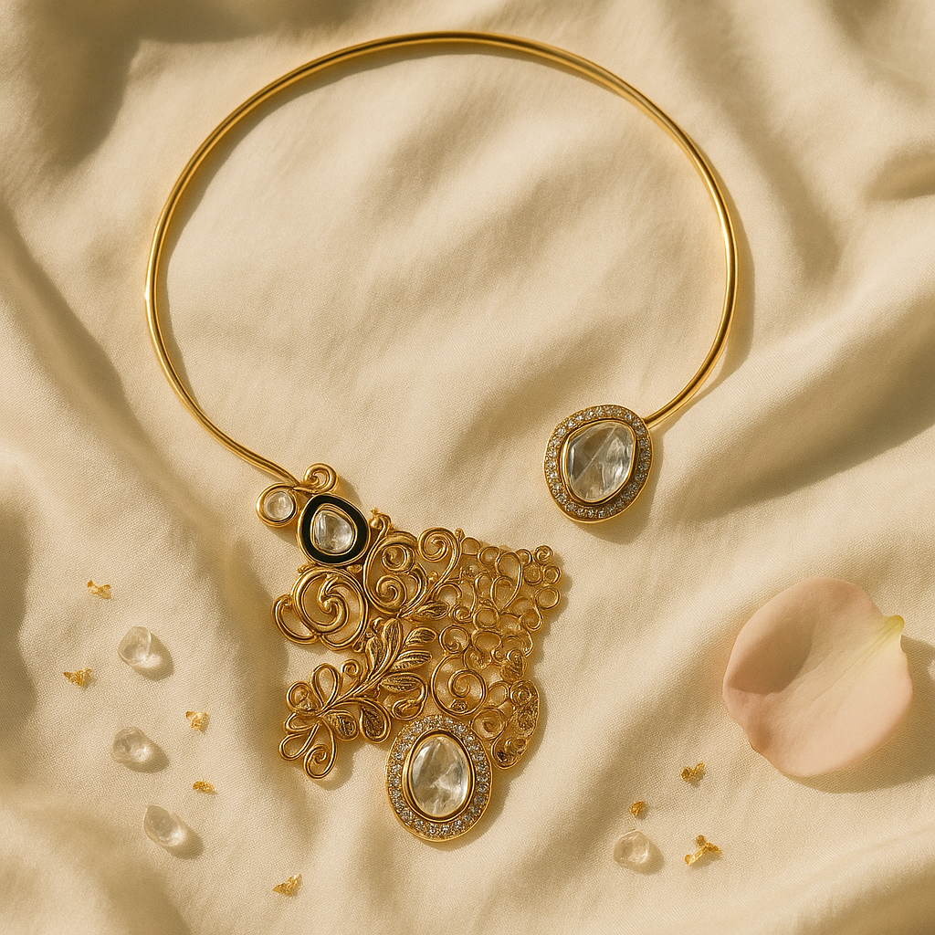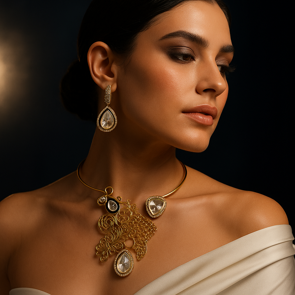 Details: Gold-plated choker necklace with intricate filigree detailing Kundan-inspired stones with AD (American Diamond) embellishments Matching teardrop earrings with dual halo sparkle Lightweight yet luxurious for long wear Ideal for bridal, festive, or evening wear