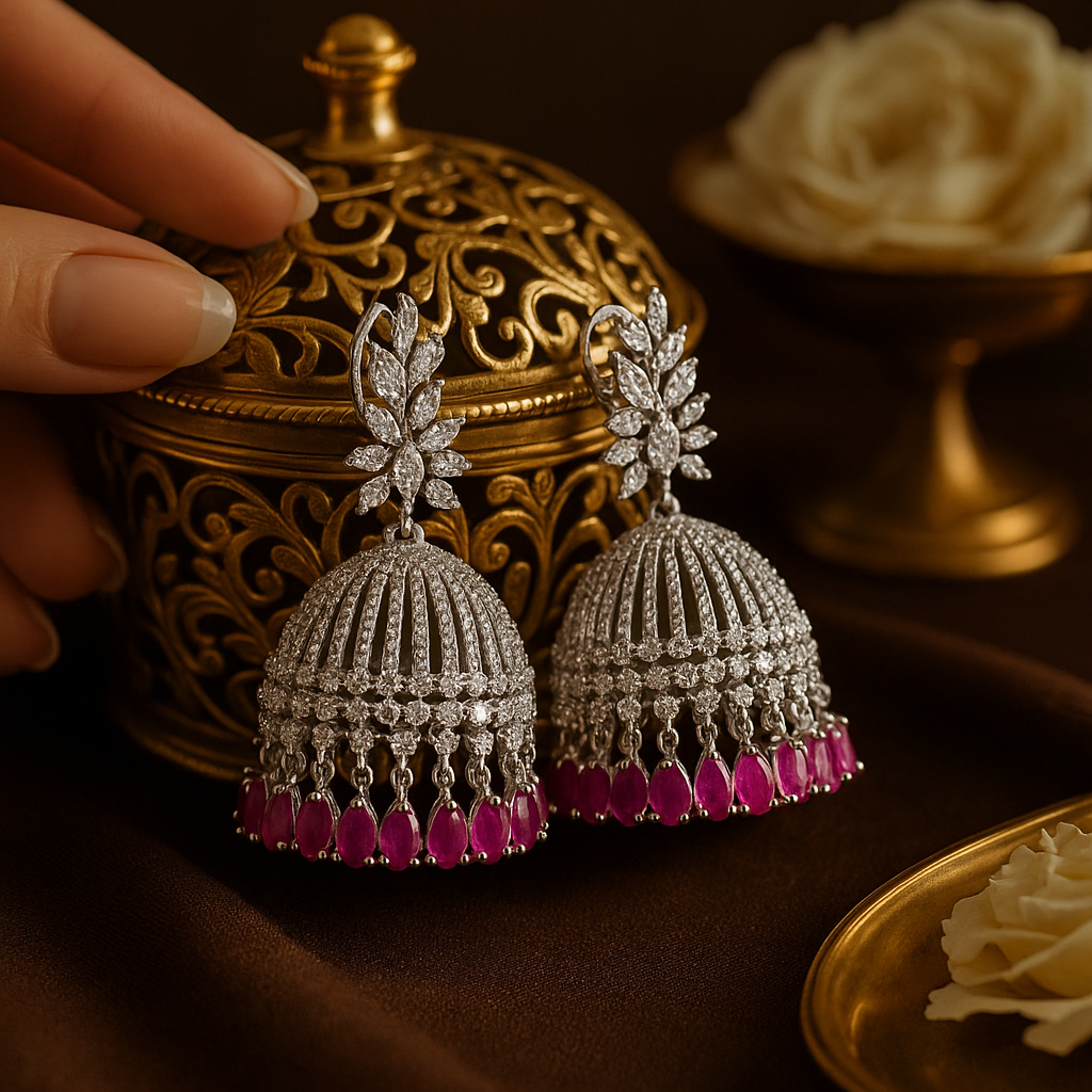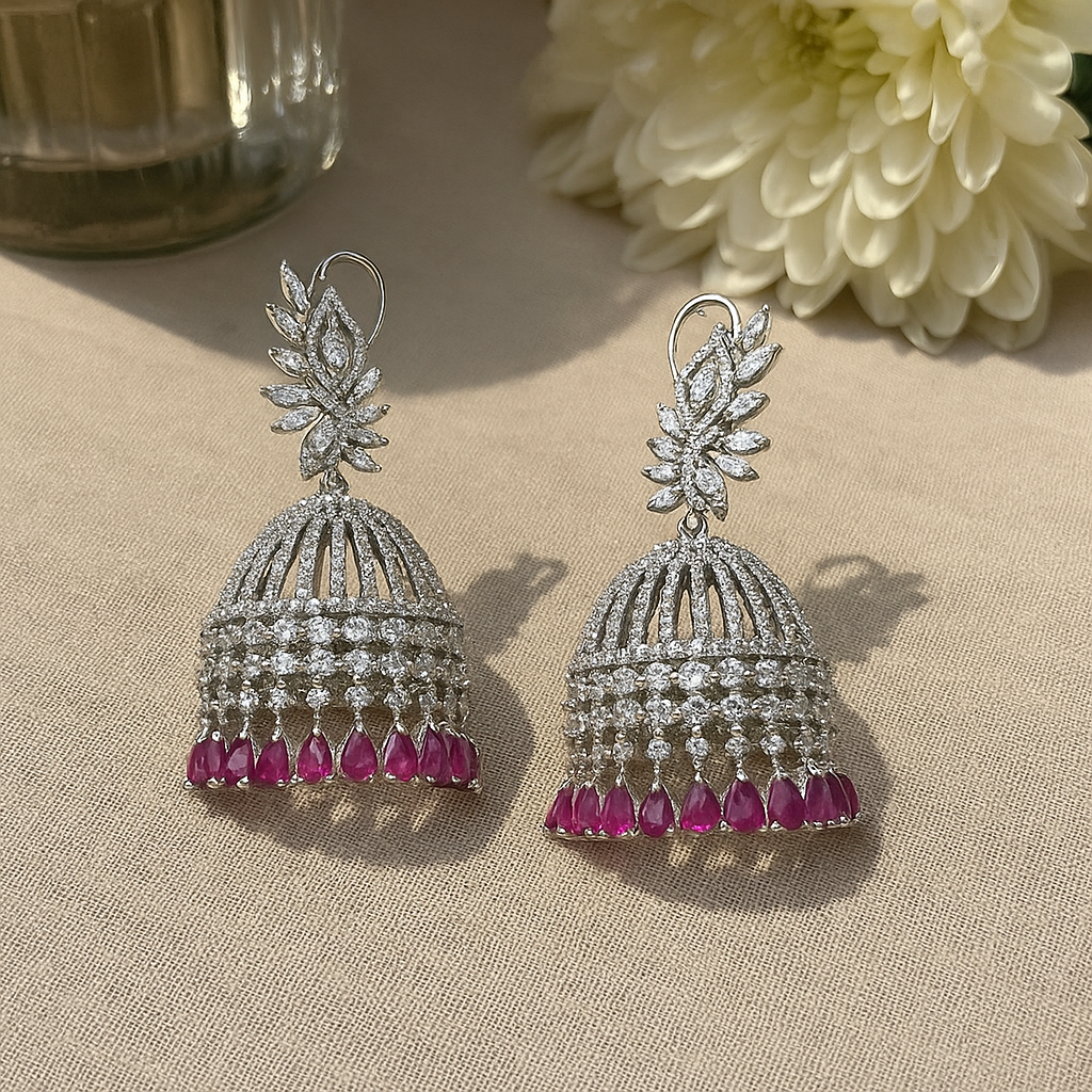 A dazzling twist on the classic jhumka, our Ruby Raag Jhumkas bring together the brilliance of silver-plating base and the richness of ruby red. These earrings feature high-shine A-grade American diamonds and Ruby gemstone drops that add a bold yet graceful flair. Lightweight yet impactful, they're the perfect fusion of traditional craftsmanship and modern glam.