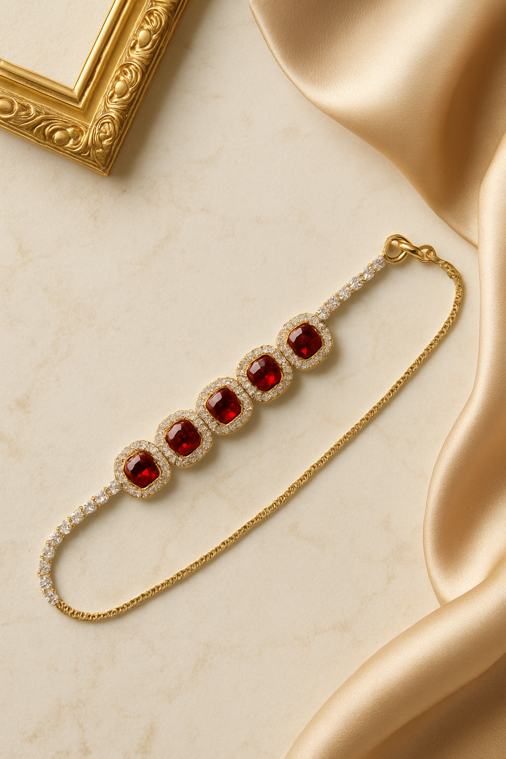 The Seraphina Garnet Bracelet is the epitome of opulent charm. Featuring bold cushion-cut garnet-red stones surrounded by radiant halos of AAA grade American diamonds, this gold-plated bracelet glows with sophistication. Adjustable for comfort and designed to captivate, itÕs the perfect choice for festive occasions, weddings, and evening celebrations where elegance takes centre stage.
