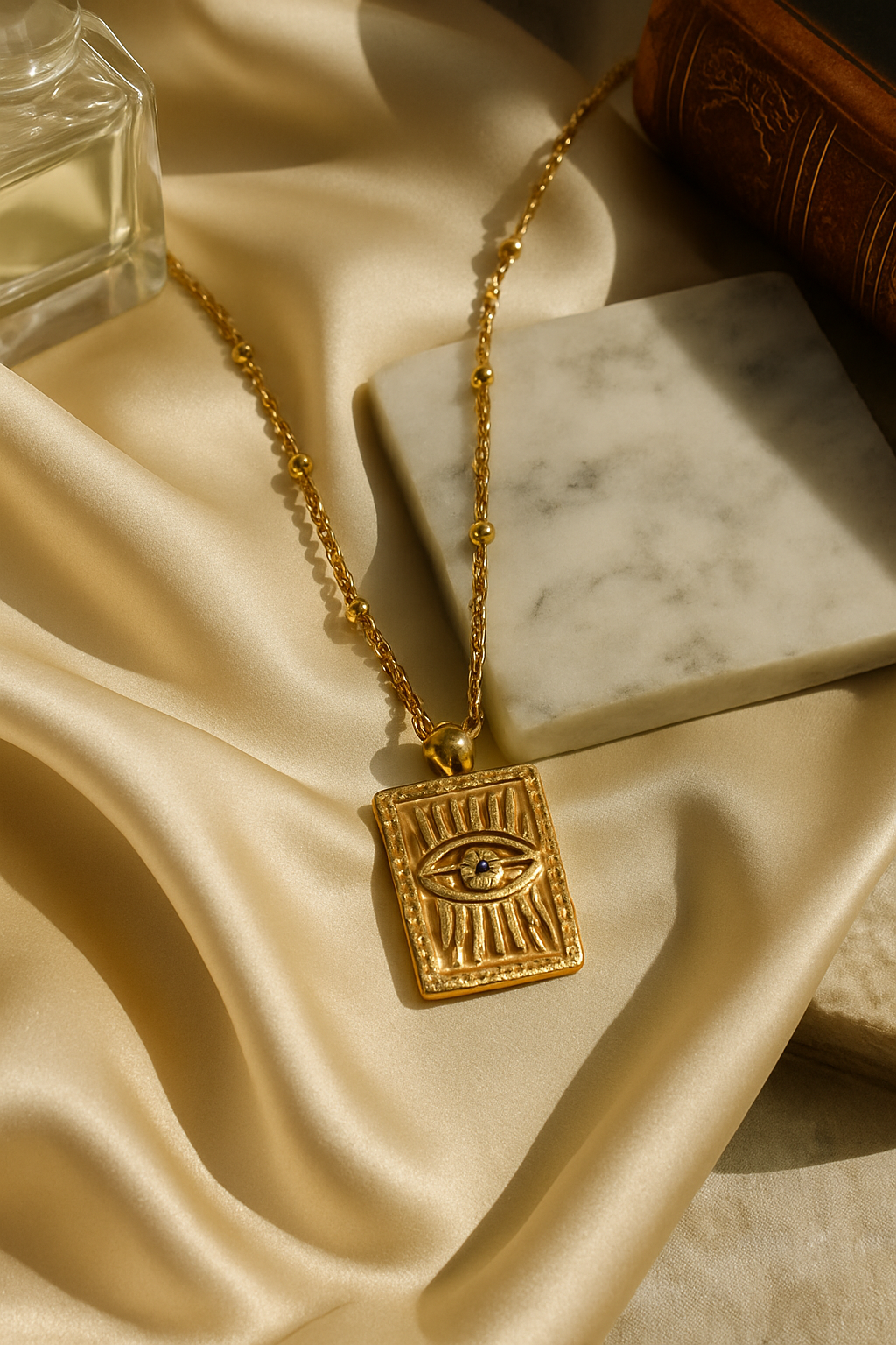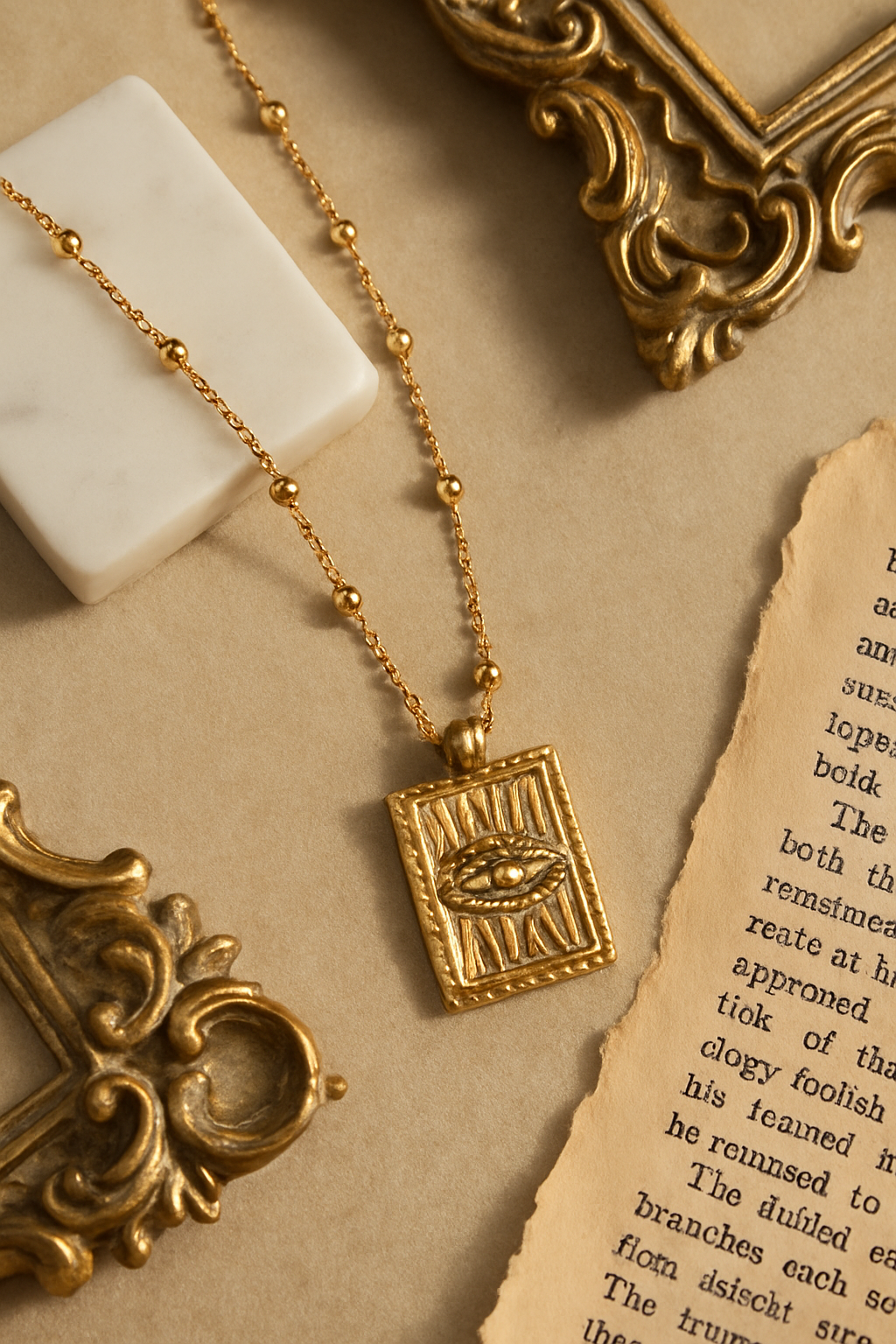 The Solara Evil Eye Pendant Necklace is a bold talisman of strength and protection, crafted for the modern muse. Featuring a textured rectangular gold-plated pendant etched with an eye motif, it exudes mystique and sophistication. The delicate beaded chain adds a refined touch, making it versatile enough to layer or wear solo as a statement piece.