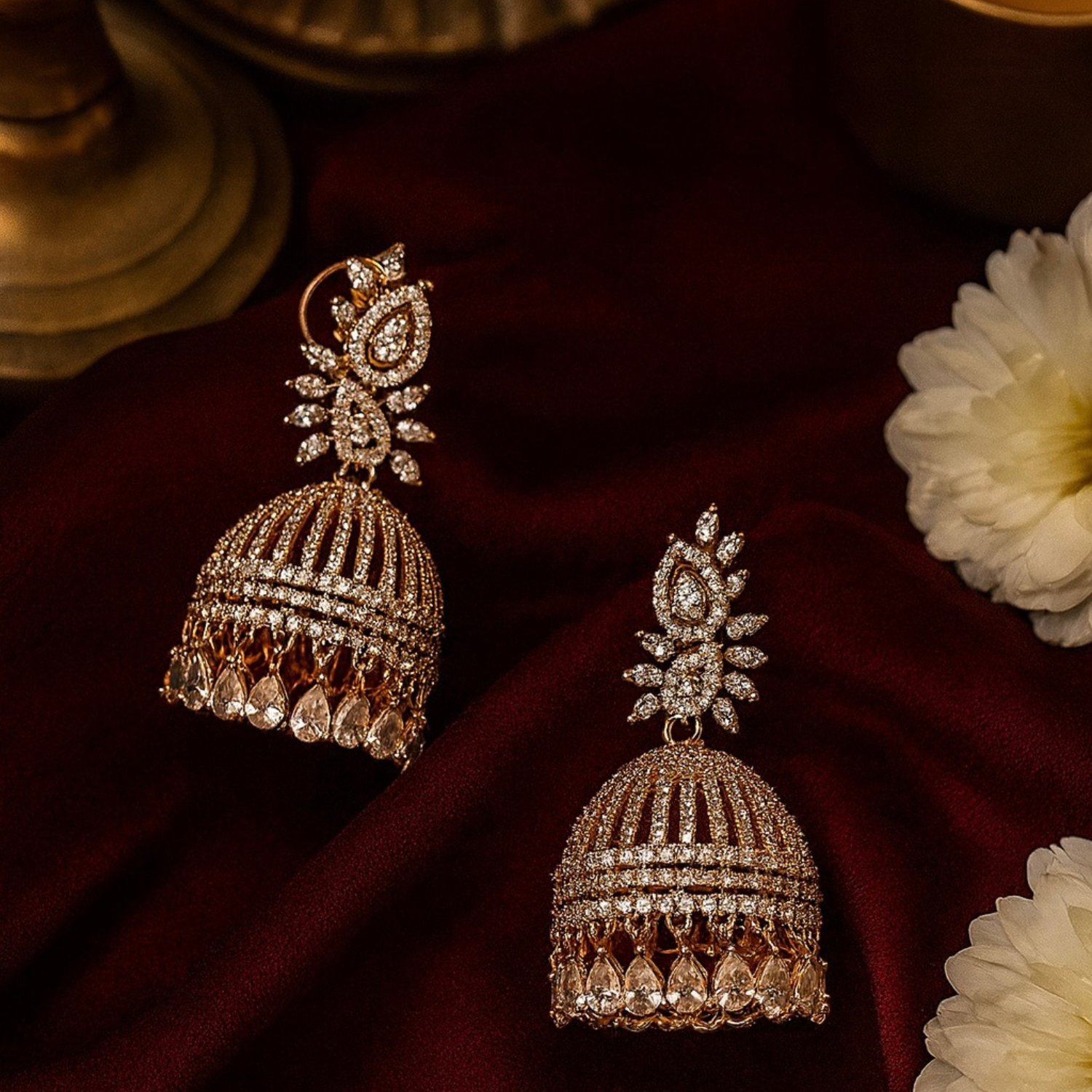 Drape yourself in timeless radiance with our Suroor Rose Dome Jhumkas, a breathtaking blend of heritage and high-shine. These statement earrings are a modern twist on the classic jhumka silhouette, meticulously crafted in rose gold plated, and encrusted with A-grade American diamond teardrops for maximum brilliance.